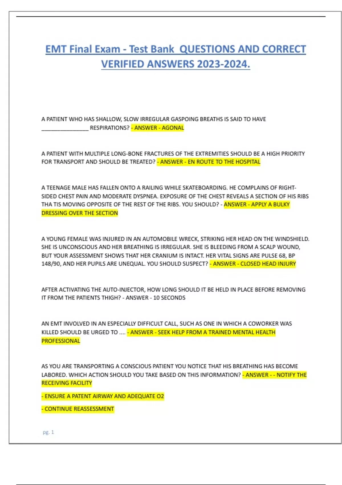 EMT Final Exam - Test Bank QUESTIONS AND CORRECT