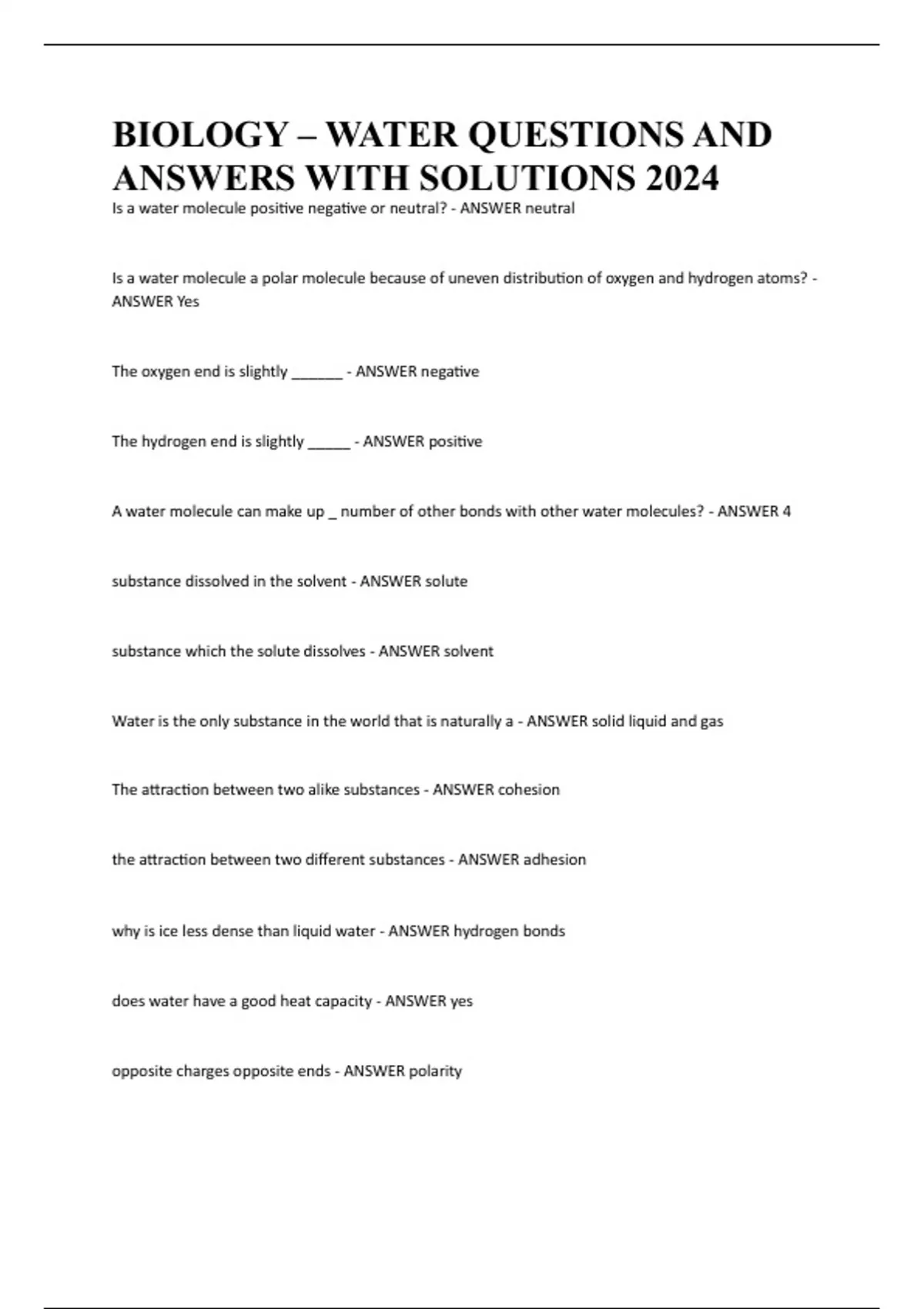 BIOLOGY – WATER QUESTIONS AND ANSWERS WITH SOLUTIONS 2024