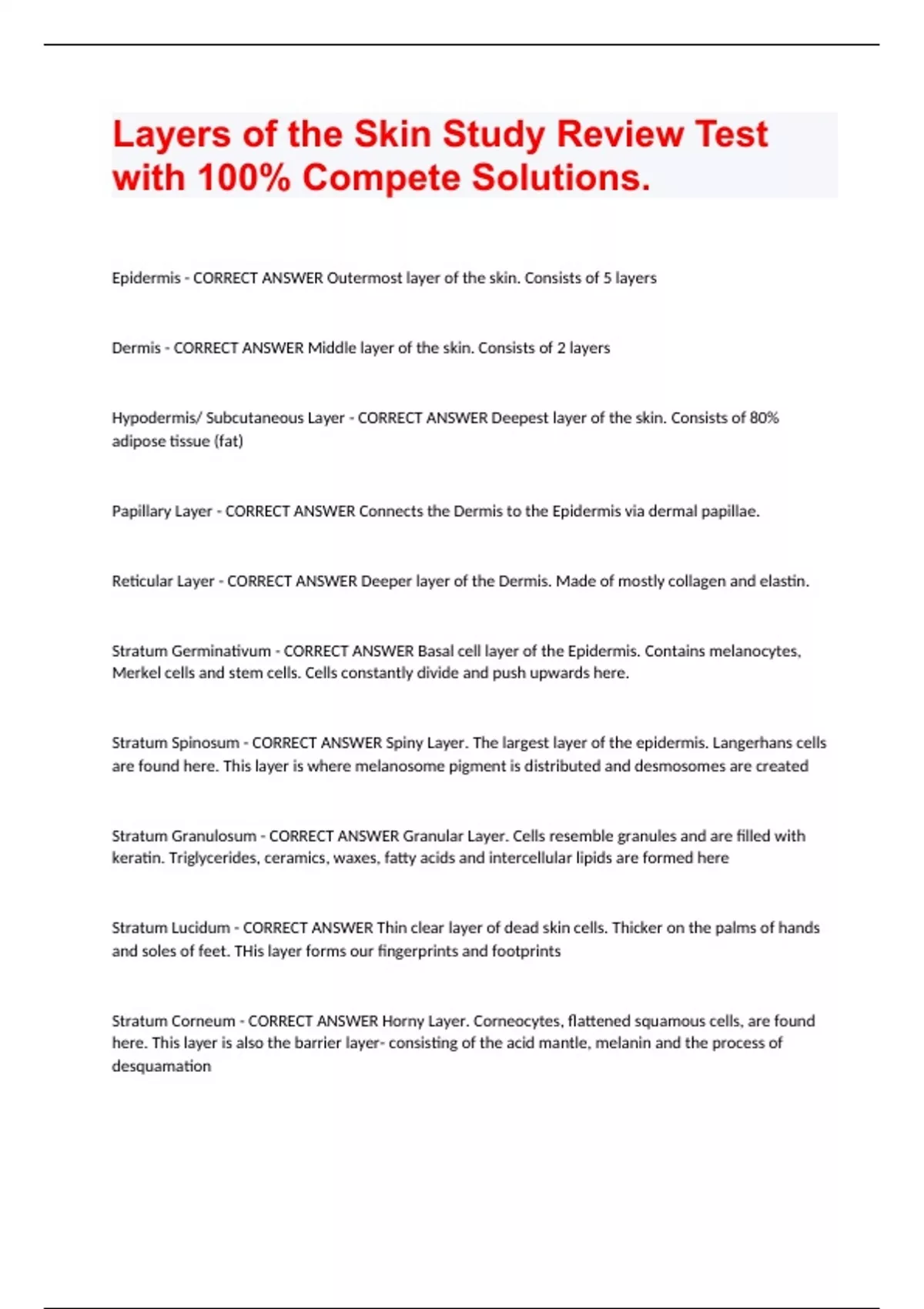 Layers of the Skin Study Review Test with 100% Compete Solutions.