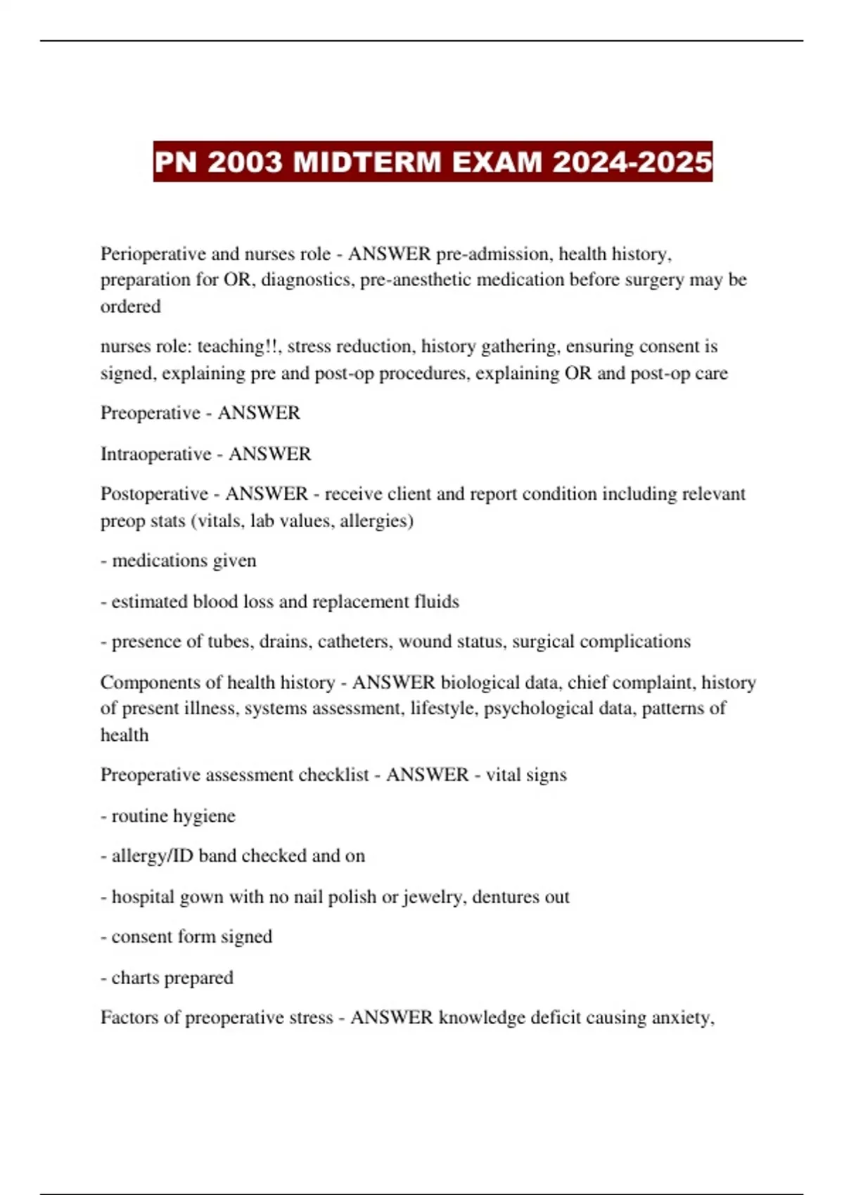 PN 2003 MIDTERM EXAM 2024- 2025 Perioperative and nurses role - ANSWER pre-admission, health history, preparation for OR, diagnostics, pre-anesthetic medication before surgery ma y be ordered nurses role: teaching!!, stress reduction, history gathering, ensuring consent is signed, explaining pre and post-op procedures, explaining OR and po st-op care Preoperative - ANSWER Intraoperative - ANSWER Postoperative - ANSWER - receive client and report condition including relevan t preop stats (vitals, lab values, allergies) - medications given - estimated blood loss and replacement fluids - presence of tubes, drains, catheters, wound status, surgical complicatio ns Components of health history - ANSWER biological data, chief compl aint, history of present illness, systems assessment, lifestyle, psychological data, patterns of health Preoperative assessment checklist - ANSWER - vital signs - routine hygiene - allergy/ID band checked and on - hospital gown with no nail polish or jewelry, dentures out - consent form signed - charts prepared Factors of preoperative stress - ANSWER knowledge deficit causing anxiety, anger, anticipatory grieving (could be loss of limb), What do patients do with valuables during preop - ANSWER don't bring them, lock up or put away whatever is brought, could also leave items with family me mber Latex allergy risk factors - ANSWER - history of anaphylactic reaction of unknown etiology during medical procedure - multiple surgical procedures (especially from infancy) - allergies (particularly kiwi, bananas, avocado, chestnuts, poinsettia plants) - job with daily exposure to latex (medical, nursing, food handler, tire manufac ture etc) - asthma Crossmatch - ANSWER testing compatibility of the blood or tissues of a donor and a recipient by mixing them to determine the absence of agglutination reactions Can students act as a witnesses for a consent form - ANSWER No, the must ha ve a licensed buddy nurse with them to witness Who is required to ask the client to sign an informed consent form for surgery? Is anyone else present - ANSWER the surgeon the witness must be present, nurse can be it General anesthesia mode of delivery - ANSWER inhalation or IV Spinal anesthesia mode of delivery - ANSWER local anesthetic inserted betwee n L4/5, goes into the spinal fluid in (subarachnoid space) Epidural anesthesia mode of delivery - ANSWER local anesthetic injected in epidural space, around L5 Regional anesthesia mode of delivery - ANSWER nerve block to a specific area Local anesthesia mode of delivery - ANSWER local anaesthetic to a specific part of the body, injected or topical Caudal block - ANSWER local anesthetic injected into sacral hiatus (end bit of epidural) Surgical risks - ANSWE R - chronic resp or cardio disorders - diabetes - renal or liver disease - malnutrition or obesity - certain meds or drug abuse - nicotine or alcoholism Common post-op problems - ANSWER - airway compromise - breathing/respiratory insufficiency - cardiac compromise - neurological compromise - hypothermia - pain, nausea/vomiting - wound dehiscence and delayed healing - side effects of analgesia How often do you check vitals post op - ANSWER immediately after, then ev ery 15 minutes for the first hour or until stable, every 30 minutes the following 2 hours, and once an hour for the following 4 hours check every 4 hours for 24-48 hours (check orders) Post-op nursing care - ANSWER - maintain airway - encourage deep breathing and coughing - promote tissue perfusion