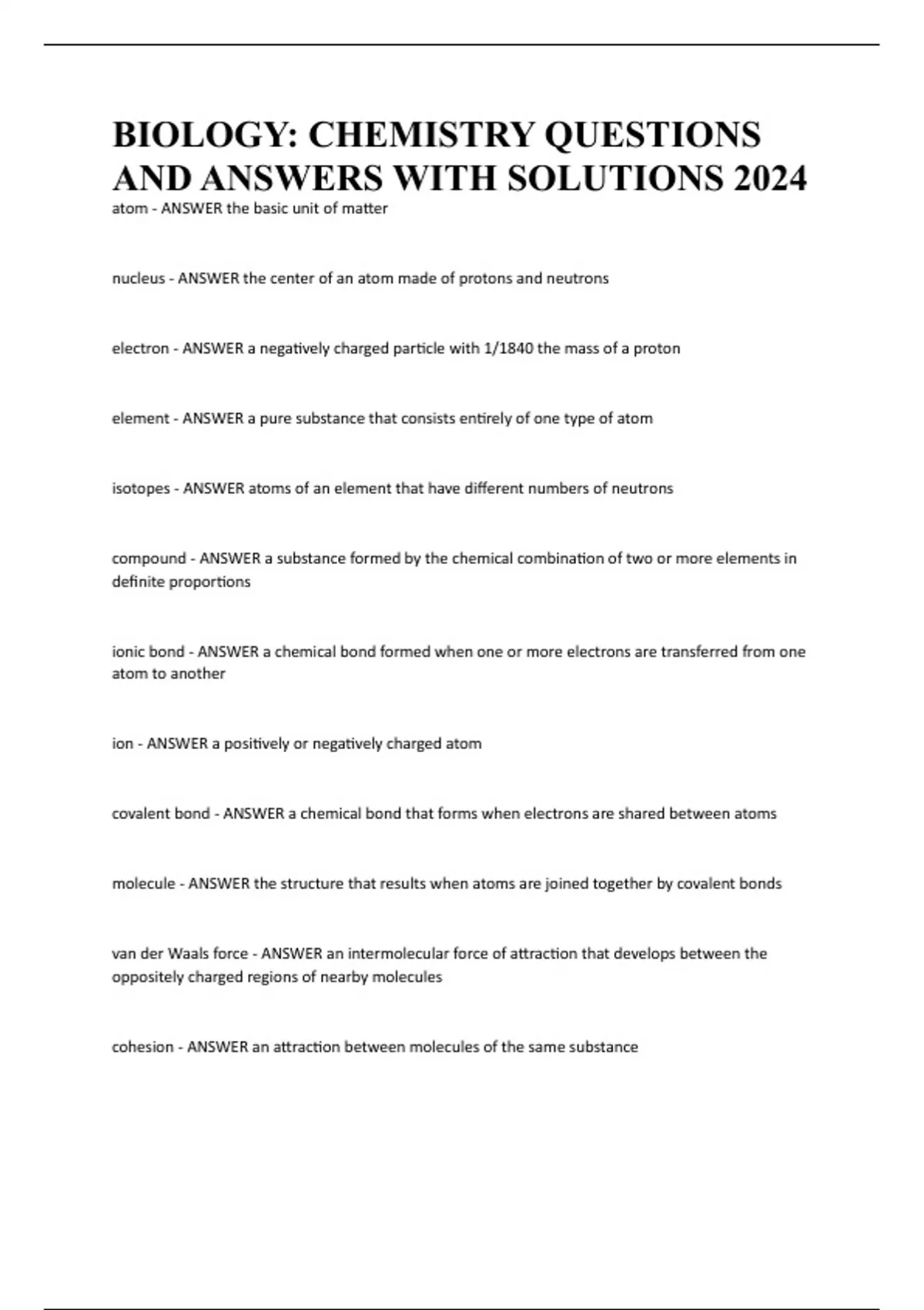 BIOLOGY: CHEMISTRY QUESTIONS AND ANSWERS WITH SOLUTIONS 2024