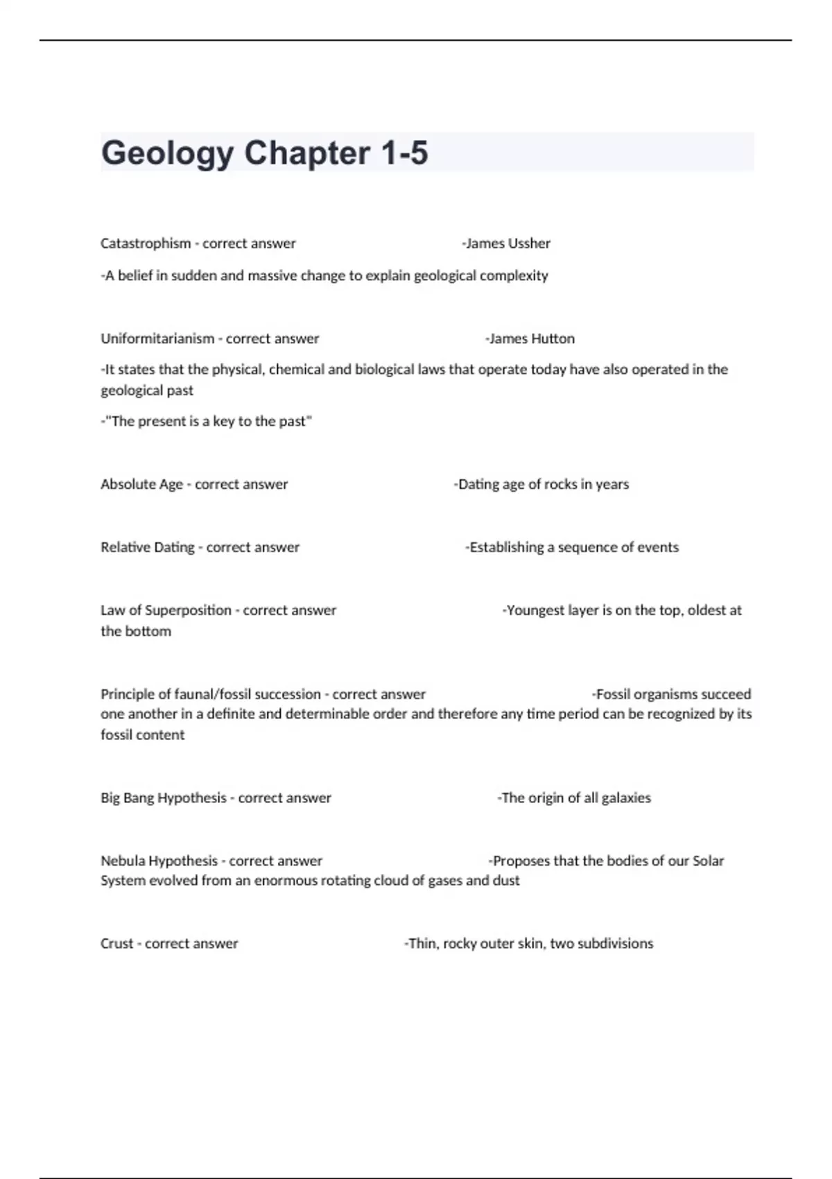 Catastrophism - correct answer -James Ussher -A belief in sudden and massive change to explain geological complexity Uniformitarianism - correct answer -James Hutton -It states that the physical, chemical and biological laws that operate today have also operated in the geological past -"The present is a key to the past" Absolute Age - correct answer -Dating age of rocks in years Relative Dating - correct answer -Establishing a sequence of events Law of Superposition - correct answer -Youngest layer is on the top, oldest at the bottom Principle of faunal/fossil succession - correct answer -Fossil organisms succeed one another in a definite and determinable order and therefore any time period can be recognized by its fossil content Big Bang Hypothesis - correct answer -The origin of all galaxies Nebula Hypothesis - correct answer -Proposes that the bodies of our Solar System evolved from an enormous rotating cloud of gases and dust Crust - correct answer -Thin, rocky outer skin, two subdivisions Oceanic Crust - correct answer -7 km/5m thick, basalt Continental Crust - correct answer -35-40 km/25m, many types of rocks Core - correct answer -Iron nickel alloy -Outer Core- liquid, generates earths magnetic field -Inner Core- located in the very center of Earth, solid and strong due to immense pressure Lithosphere - correct answer -Forms relatively cool, brittle plates of plate tectonics, crust and upper mantle Astenosphere - correct answer -Upper mantle, "weak" Mesosphere - correct answer -lower mantle, rocks are rigid but capable of very gradual flow Mountain Belts - correct answer -Circum Pacific and Alps Indonesia Cratons - correct answer -Flat and stable areas *Shields- core of continents, made of igneous and metamorphic rocks *Platforms- marginal parts of shields covered by sediments Continental Margins - correct answer -Shelf, slope, rise Deep-Ocean Basins - correct answer -Abyssal Plains, deep oceanic trenches, seamounts Ocean ridge system - correct answer -Continuous belt that winds for more than 70,000 km Igneous - correct answer -Rocks formed as a result of magma's cooling and crystallization -Originally from MAGMA Sedimentary - correct answer -Rocks formed as a result of lithification(compaction and cementation) of a sediments -Originally from EVERY rock Metamorphic - correct answer -Rocks formed as a result of heat and pressure effect igneous and sedimentary rocks -Originally from EVERY rock Viscosity - correct answer -a measure of a material's resistance to flow What 3 factors actually control the viscosity of a given magma? - correct answer -Composition- Silica content...Higher silica content=higher viscosity...Lower silica content=lower viscosity -Temperature- hotter magmas are less viscous -Dissolved gases-gas content affects magma mobility Basaltic Lavas - correct answer -mild eruptions -fluid like behavior Rhyolitic or Andesitic - correct answer -explosive eruptions Pahoehoe lava - correct answer -Basaltic flow -Ropy surface -relatively smooth skin that wrinkles Aa Lava - correct answer -Basaltic flow -Blocks Pyroclastic Flow - correct answer -Felsic and intermediate -consists of ash, pumice, and other debris -Material ejected at high velocities Nuee Ardente - correct answer -Felsic and intermediate -A deadly pyroclastic(fire fragments) flow - glowing avalanches (silver cloud) Lahar - correct answer -Felsic and intermediate -Volcanic mudflow Crater - correct answer -Summit depression < 1 km diameter Caldera - correct answer -Summit depression > 1 km diameter produced by collapse following a massive eruption -Yellow Stone National Park -Atlantis may have disappeared in caldera of volcano on Santorini island Vent - correct answer -surface opening connected to the magma chamber, located at a slopes of volcano Conduit - correct answer -A pipelike opening through which magma moves from magma chamber toward Earth's surface Fumarole - correct answer -Emit only gases and smoke Shield Volcanoe - correct answer -Broad, slightly domed shaped -Largest -Mauna Loa on Hawaii Cinder Cone - correct answer -Steep slope angle -Smallest -Not very dangerous but has potential Composite Cone - correct answer -(Stratovolcano) -Most located adjacent to the Pacific Ocean -Medium sized -classic shaped volcano -Most violent type of activity Pluton - correct answer -Most magma is emplaced at depth in the Earth -Once cooled and solidified, its called a... -Intrusive body of igneous rocks Dike - correct answer -a tabular, discordant(cutting through) pluton Sill - correct answer -A tabular, concordant pluton Laccolith - correct answer -Mushroom shaped concordant pluton Batholith - correct answer -Largest intrusive body -Surface exposure > 100 km^2 -Frequently form the cores of mountains Fissures - correct answer -Fractures in the crust, long narrow cracks, emit a low viscosity basaltic lava, blanketing a wide area Basalt Plateau - correct answer -Flat lying basaltic flows, covering hundreds of square kilometers -Example: Deccan Traps in India Subduction Zones - correct answer -Convergent plate boundaries -Pacific Ocean is a Ring of Fire Mid-ocean ridges - correct answer -Divergent plate boundaries Intraplate volcanism is related to Hot Spot and Mantle Plumes - correct answer ... Igneous Rocks form? - correct answer -By crystallization and consolidation of molten magma Magma - correct answer -A liquid component-melt -A solid component- silicate materials -Gaseous Phase- Volatiles Intrusive - correct answer -Plutonic rocks -Magma crystallize under the surface Extrusive - correct answer -Volcanic rocks -Lava cools on the surface "Magma at surface is called Lava" Texture - correct answer -size, shape and arrangement of mineral grains Slow rate of cooling.. - correct answer -fewer but larger crystals Fast rate of cooling.. - correct answer -many small crystals Very fast.... - correct answer -forms glass Phaneritic - correct answer -slow rate of cooling -large, visible crystals -our granite Aphanitic - correct a