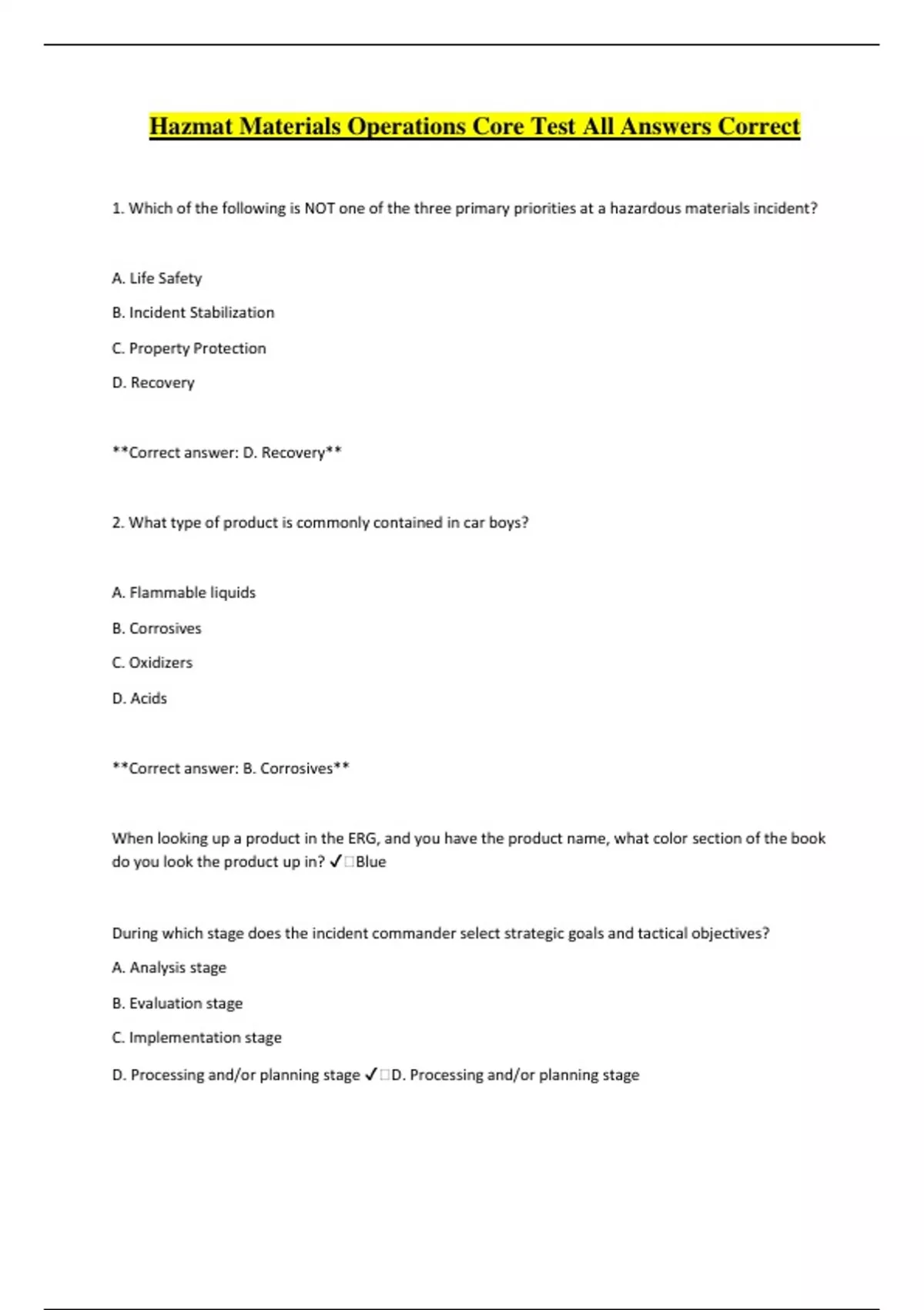 Hazmat Materials Operations Core Test All Answers Correct 1. Which of the following is NOT one of the three primary priorities at a hazardous materials incident? A. Life Safety B. Incident Stabilization C. Property Protection D. Recovery **Correct answer: D. Recovery** 2. What type of product is commonly contained in car boys? A. Flammable liquids B. Corrosives C. Oxidizers D. Acids **Correct answer: B. Corrosives** When looking up a product in the ERG, and you have the product name, what color section of the book do you look the product up in? ️Blue During which stage does the incident commander select strategic goals and tactical objectives? A. Analysis stage B. Evaluation stage C. Implementation stage D. Processing and/or planning stage ️D. Processing and/or planning stage In the white section of the NFPA 704 marking system, what does it stand for? ️Special precautions Which of the following incident levels is the most serious of all hazardous materials incidents A. Level l B. Level ll C. Level lll D. Level lV ️C. Level lll Which level of protection gives the highest respiratory and chemical protection? A. Level A B. Level B C. Level C D. Level D ️A. Level A Which transport trailer carries chemicals, mild corrosives and is called the workhouse of the industry? A. MC 306 B. MC 307 C. MC 312 D. MC 331 ️MC 307 The boundary established to prevent access by the public and unauthorized persons is called the A. Traffic Cordon B. Isolation perimeter C. Warm Zone Boundary D. Area of safe refuge, triage/treatment area, staging area ️B. Isolation Perimeter The Hazard class for gases is ️Class B The area surrounding an incident that is potentially very dangerous either because it presents a threat in the form of a hazardous material for their effects thereof is called ️Hot Zone Highest level of respiratory but a lesser chemical protection ️Level B The area that the responders move the victims that are in the hot zone while waiting to be decontaminated is called A. Exclusion zone B. Support zone C. Safe haven/safe refuge ️C. Safe haven/safe refuge Gross decontamination is done in what zone ️Hot Zone When using the incident command system operations level responders who most commonly report directly to the? A. Operations Officer B. Planning Officer C. Incident Commander D. Safety Officer ️A. Operations Officer The area with the highest degree of contamination is the ️Exclusion Zone Which of the following measures dose-response through inhalation? A. LD50 B. LDLO C. TDLO D. LCLO ️D. LCLO A gas substance is lighter than air; its " " is therefore less than "1"