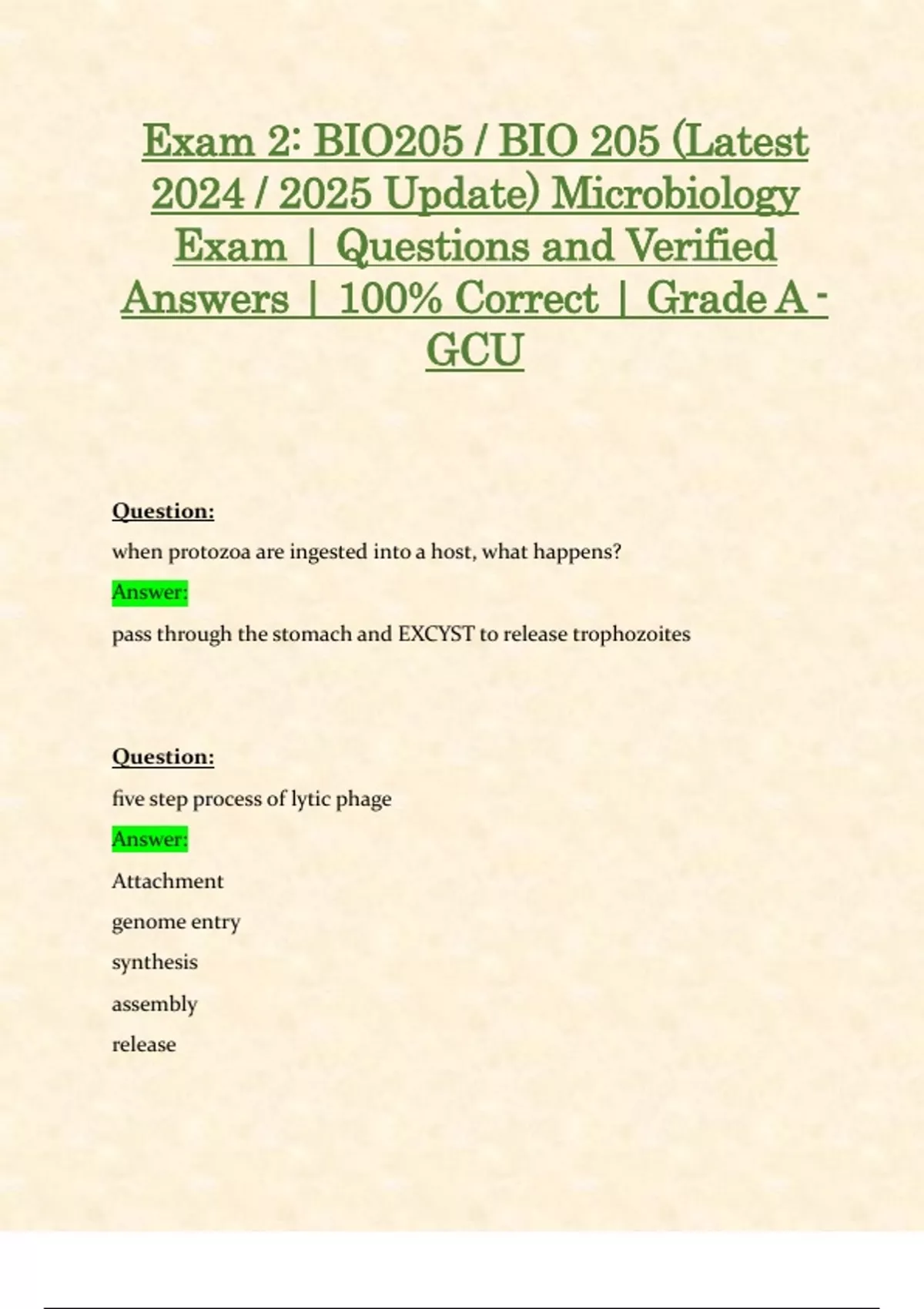 Exam 2: BIO205 / BIO 205 (Latest 2024 / 2025 Update) Microbiology Exam | Questions and Verified Answers | 100% Correct | Grade A - GCU Question: when protozoa are ingested into a host, what happens? Answer: pass through the stomach and EXCYST to release trophozoites Question: five step process of lytic phage Answer: Attachment genome entry synthesis assembly release Question: which phage replicates inside the host and then lyses its host during release? Answer: lytic or virulent phage Question: what happens during replication of animal virus infection Answer: replicase allows antigenic drift Question: apicomplexans Answer: apical complex, sexual reproduction occurs in definitive host Question: lumen-dwelling flagellates Answer: lack mitochondria and form hydrogenosome