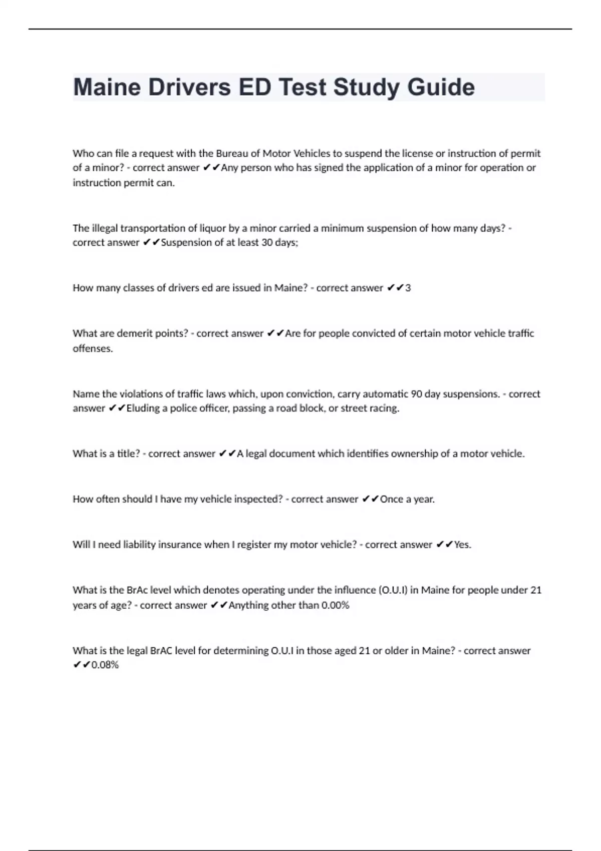 Maine Drivers ED Test Study Guide