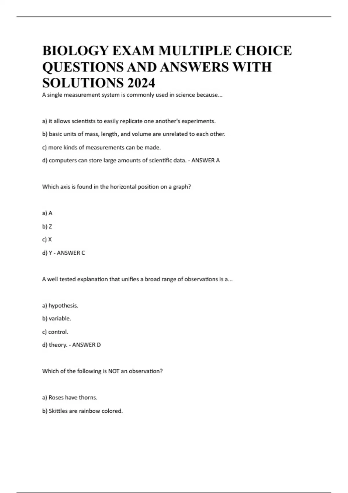 BIOLOGY EXAM MULTIPLE CHOICE QUESTIONS AND ANSWERS WITH SOLUTIONS 2024