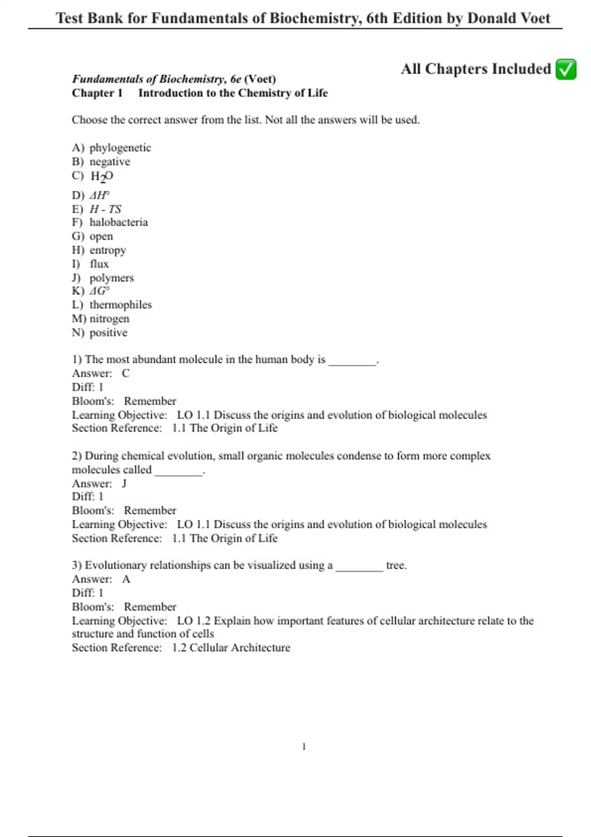 Test Bank for Fundamentals of Biochemistry, Life at the Molecular Level, 6e 6th Edition by Donald Voet, Judith G. Voet, Charlotte W. Pratt. Full Chapters are included with answers (Chapter 1 to 26) 1 Introduction to the Chemistry of Life 2 Water 3 Amino Acids 4 Proteins: Three-Dimensional Structure 5 Carbohydrates 6 Nucleotides, Nucleic Acids, and Genetic Information 7 Lipids and Biological Membranes 8 Membrane Transport 9 Enzymatic Catalysis 10 Enzyme Kinetics, Inhibition, and Control 11 Biochemical Signaling 12 Introduction to Metabolism 13 Glucose Catabolism 14 Glycogen Metabolism and Gluconeogenesis 15 Citric Acid Cycle 16 Electron Transport and Oxidative Phosphorylation 17 Photosynthesis 18 Lipid Metabolism 19 Amino Acid Metabolism 20 Mammalian Fuel Metabolism: Integration & Regulation 21 Nucleotide Metabolism 22 DNA Replication 23 DNA Repair and Recombination 24 Transcription and RNA Processing 25 Protein Synthesis 26 Regulation of Gene Expression