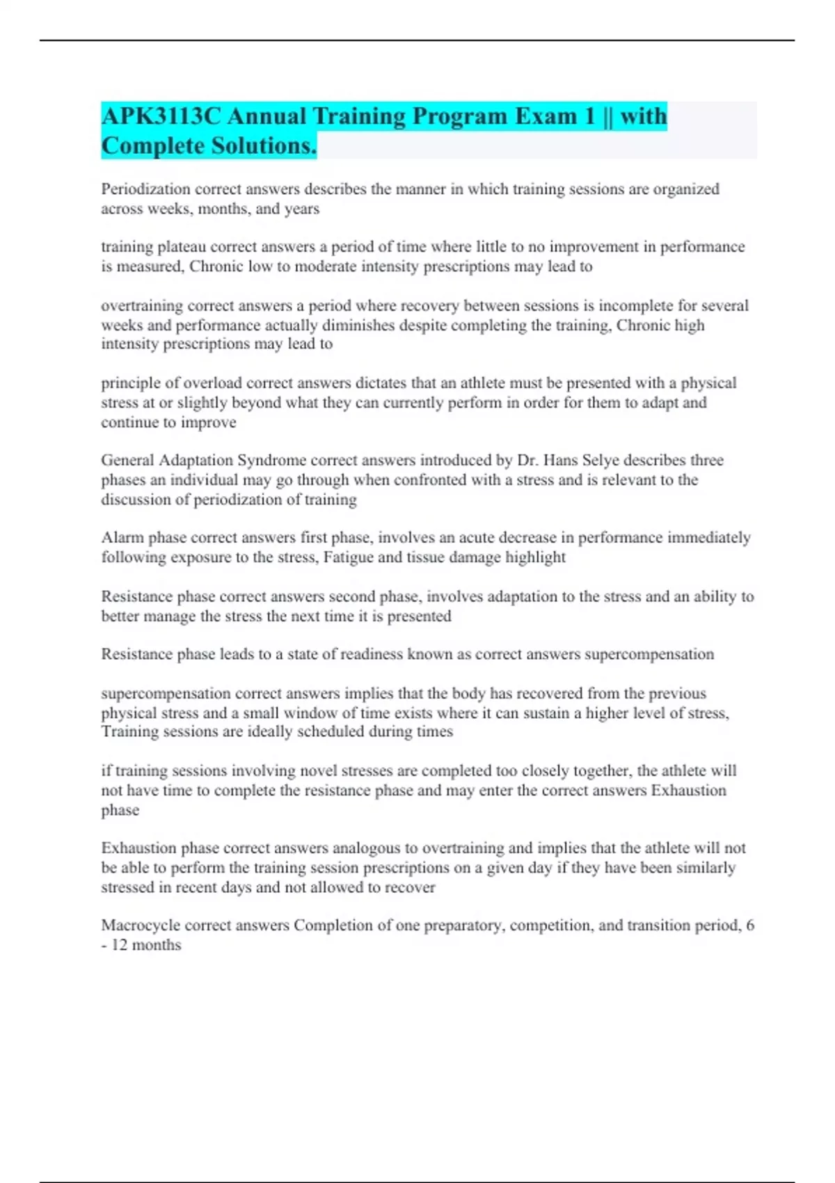 Periodization correct answers describes the manner in which training sessions are organized across weeks, months, and years training plateau correct answers a period of time where little to no improvement in performance is measured, Chronic low to moderate intensity prescriptions may lead to overtraining correct answers a period where recovery between sessions is incomplete for several weeks and performance actually diminishes despite completing the training, Chronic high intensity prescriptions may lead to principle of overload correct answers dictates that an athlete must be presented with a physical stress at or slightly beyond what they can currently perform in order for them to adapt and continue to improve General Adaptation Syndrome correct answers introduced by Dr. Hans Selye describes three phases an individual may go through when confronted with a stress and is relevant to the discussion of periodization of training Alarm phase correct answers first phase, involves an acute decrease in performance immediately following exposure to the stress, Fatigue and tissue damage highlight Resistance phase correct answers second phase, involves adaptation to the stress and an ability to better manage the stress the next time it is presented Resistance phase leads to a state of readiness known as correct answers supercompensation supercompensation correct answers implies that the body has recovered from the previous physical stress and a small window of time exists where it can sustain a higher level of stress, Training sessions are ideally scheduled during times if training sessions involving novel stresses are completed too closely together, the athlete will not have time to complete the resistance phase and may enter the correct answers Exhaustion phase Exhaustion phase correct answers analogous to overtraining and implies that the athlete will not be able to perform the training session prescriptions on a given day if they have been similarly stressed in recent days and not allowed to recover Macrocycle correct answers Completion of one preparatory, competition, and transition period, 6 - 12 months