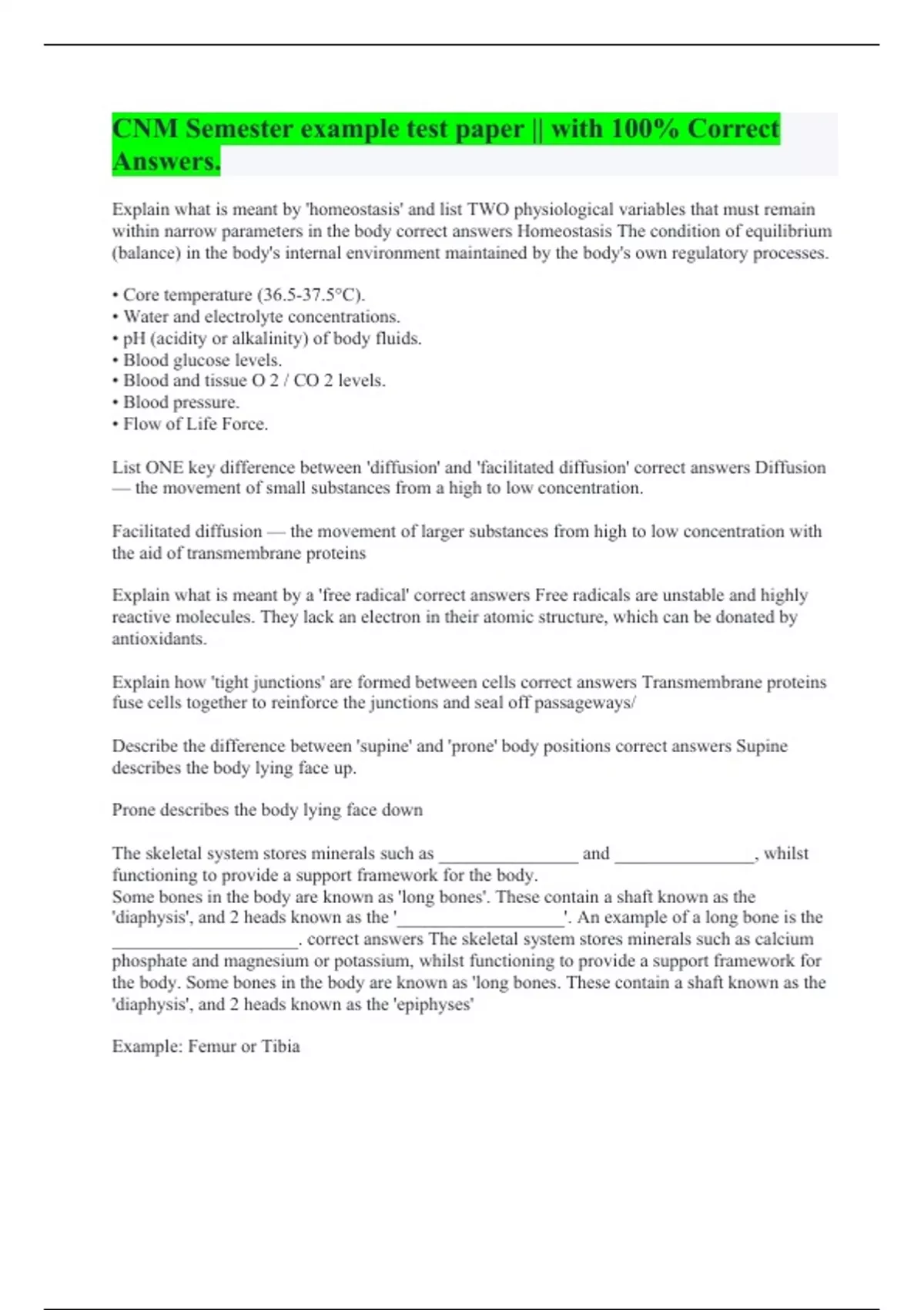 Explain what is meant by 'homeostasis' and list TWO physiological variables that must remain within narrow parameters in the body correct answers Homeostasis The condition of equilibrium (balance) in the body's internal environment maintained by the body's own regulatory processes. • Core temperature (36.5-37.5°C). • Water and electrolyte concentrations. • pH (acidity or alkalinity) of body fluids. • Blood glucose levels. • Blood and tissue O 2 / CO 2 levels. • Blood pressure. • Flow of Life Force. List ONE key difference between 'diffusion' and 'facilitated diffusion' correct answers Diffusion — the movement of small substances from a high to low concentration. Facilitated diffusion — the movement of larger substances from high to low concentration with the aid of transmembrane proteins Explain what is meant by a 'free radical' correct answers Free radicals are unstable and highly reactive molecules. They lack an electron in their atomic structure, which can be donated by antioxidants. Explain how 'tight junctions' are formed between cells correct answers Transmembrane proteins fuse cells together to reinforce the junctions and seal off passageways/ Describe the difference between 'supine' and 'prone' body positions correct answers Supine describes the body lying face up. Prone describes the body lying face down The skeletal system stores minerals such as _______________ and _______________, whilst functioning to provide a support framework for the body. Some bones in the body are known as 'long bones'. These contain a shaft known as the 'diaphysis', and 2 heads known as the '__________________'. An example of a long bone is the ____________________. correct answers The skeletal system stores minerals such as calcium phosphate and magnesium or potassium, whilst functioning to provide a support framework for the body. Some bones in the body are known as 'long bones. These contain a shaft known as the 'diaphysis', and 2 heads known as the 'epiphyses' Example: Femur or Tibia