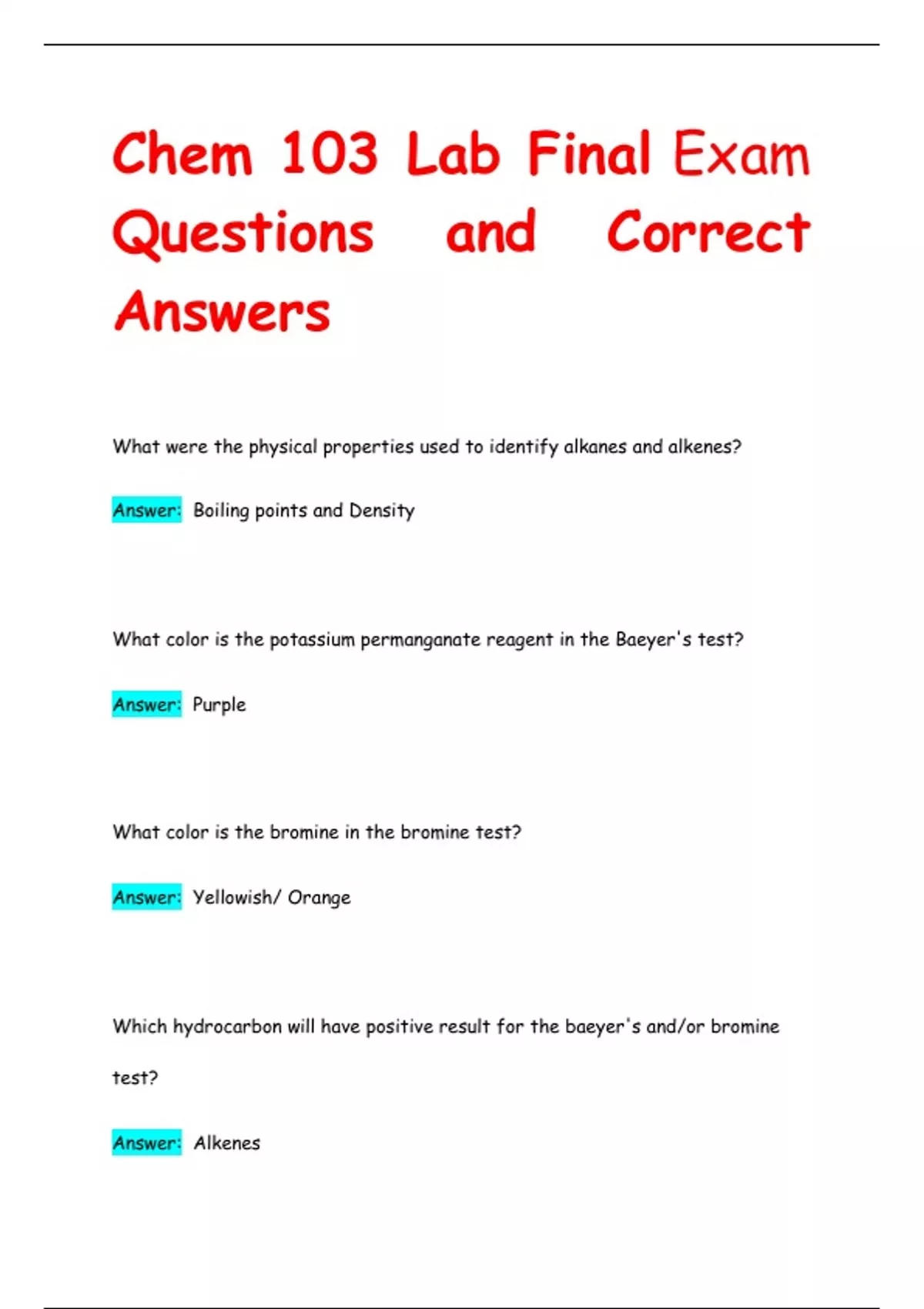 Chem 103 Lab Final Exam Questions and Correct Answers