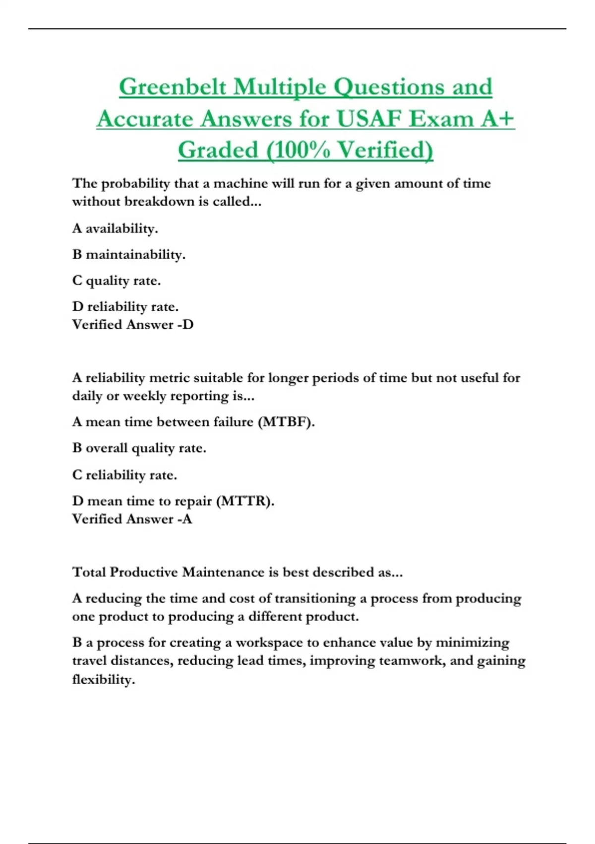 Greenbelt Multiple Questions and Accurate Answers for USAF Exam A+ Graded (100% Verified)