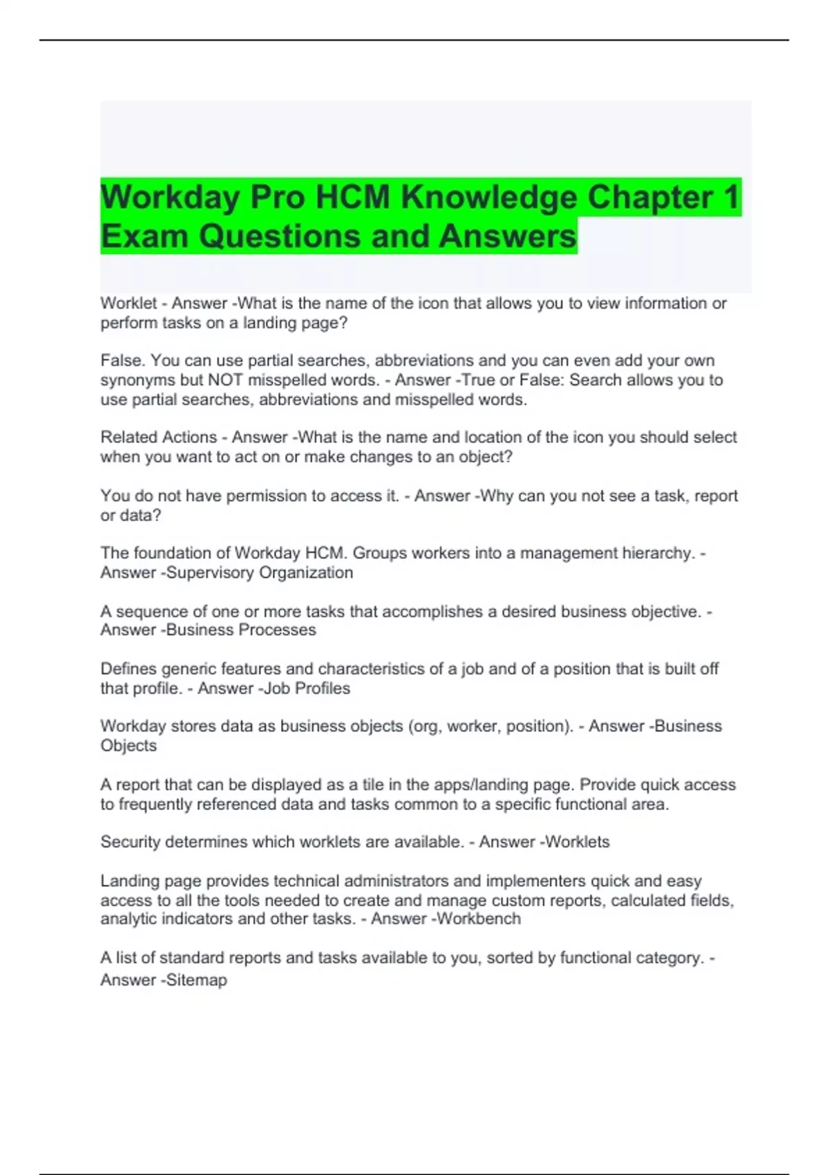 Workday Pro HCM Knowledge Chapter 1 Exam Questions and Answers