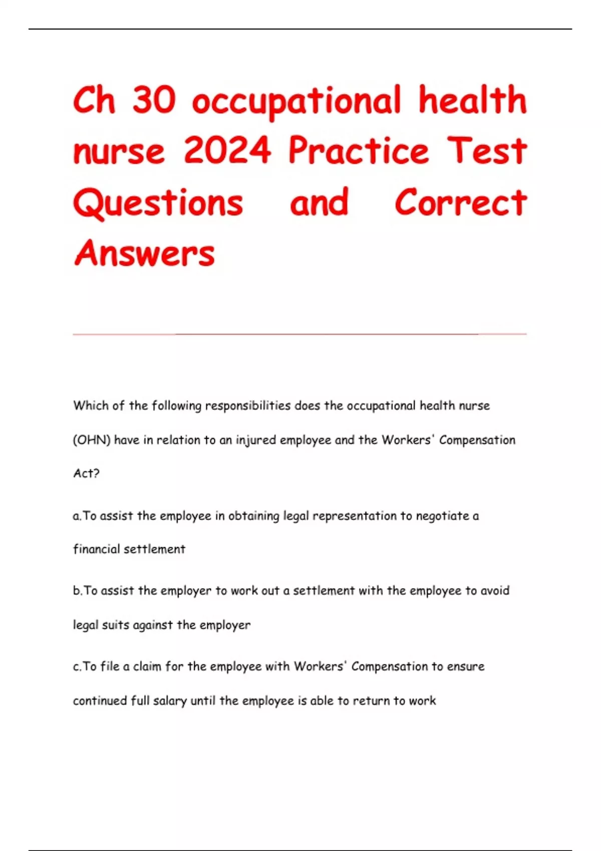 Which of the following responsibilities does the occupational health nurse (OHN) have in relation to an injured employee and the Workers' Compensation Act? a.To assist the employee in obtaining legal representation to negotiate a financial settlement b.To assist the employer to work out a settlement with the employee to avoid legal suits against the employer c.To file a claim for the employee with Workers' Compensation to ensure continued full salary until the employee is able to return to work d.To work with the employee to keep the employee informed, limit disability, and provide opportunity for rapid return to employment Ans--d.To work with the employee to keep the employee informed, limit disability, and provide opportunity for rapid return to employment To get more questions with correct answers email . We also provide Test banks and other E books to students Ans-- Which of the following best explains why occupational health nurses (OHNs) felt a need to create the Factory Nurses Conference? a.All the other specialties in nursing had created their own conferences and groups. b.Creating their own group would be less expensive to maintain membership than joining the American Nurses Association (ANA). c.Funding was made available by large employers for the nurses to meet. d.Most OHNs practiced alone and wanted to be able to interact with peers. Ans--d.Most OHNs practiced alone and wanted to be able to interact with peers