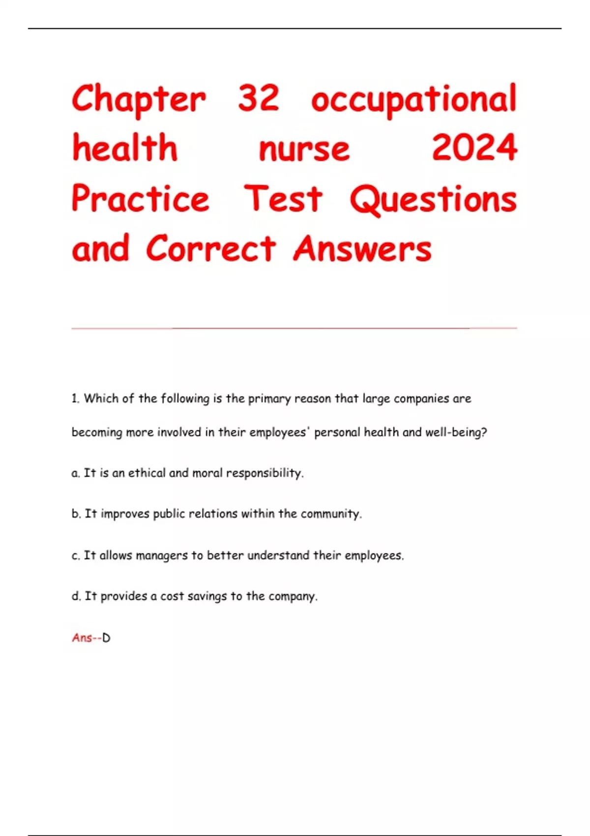 1. Which of the following is the primary reason that large companies are becoming more involved in their employees' personal health and well-being? a. It is an ethical and moral responsibility. b. It improves public relations within the community. c. It allows managers to better understand their employees. d. It provides a cost savings to the company. Ans--D 2. A nurse who works for a hospital in employee health notes that several nurses from one unit have missed work after contracting a communicable disease from a patient. Which of the following best describes the host factor? a. Each sick nurse b. The communicable disease c. The hospital d. The patient Ans--A To get more questions with correct answers email . We also provide Test banks and other E books to students Ans-- 3. Which of the following groups should the occupational health nurse devote the most time to regarding education and follow-up evaluation? a. New workers employed less than 1 year b. Older workers with chronic illnesses c. Older workers with diminished hearing d. Women in their childbearing years Ans--A