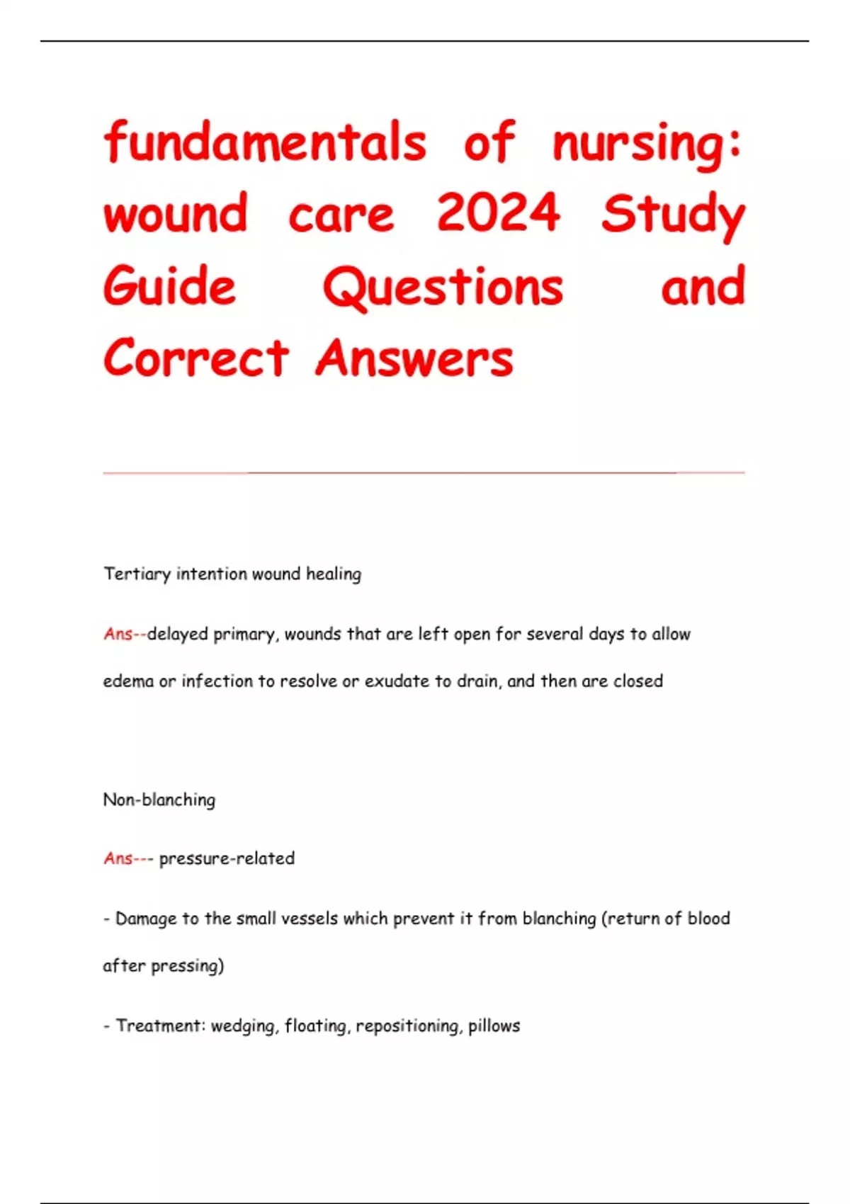 Tertiary intention wound healing Ans--delayed primary, wounds that are left open for several days to allow edema or infection to resolve or exudate to drain, and then are closed Non-blanching Ans--- pressure-related - Damage to the small vessels which prevent it from blanching (return of blood after pressing) - Treatment: wedging, floating, repositioning, pillows To get more questions with correct answers email . We also provide Test banks and other E books to students Ans-- stages of wound healing Ans--1. Hemostasis phase 2. Inflammatory phase 3. Proliferative phase 4. Maturation (remodeling) phase Blanching Ans--- moisture- related - Shows adequate blood supply in tissues - Treatment: keep dry Hemostasis Phase Ans--- Vasoconstriction and clotting - Platelets attract cells that repair inflammatory stage Ans--Vasodilatation= plasma and blood cells increase edema, erythema, exudate Proliferative phase Ans--- Epithelization - Granulation maturation/remodeling stage Ans--Scar development wound classifications Ans--- open vs. closed - acute vs. chroni