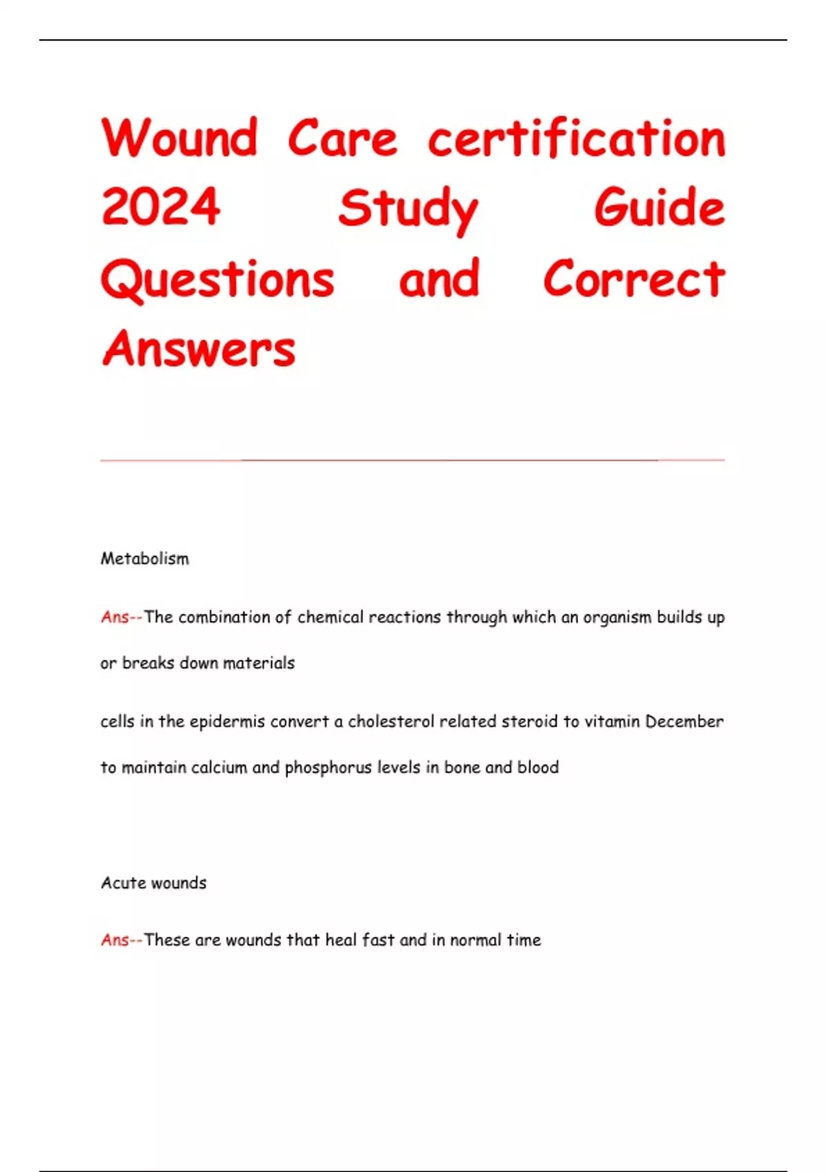 Metabolism Ans--The combination of chemical reactions through which an organism builds up or breaks down materials cells in the epidermis convert a cholesterol related steroid to vitamin December to maintain calcium and phosphorus levels in bone and blood Acute wounds Ans--These are wounds that heal fast and in normal time To get more questions with correct answers email . We also provide Test banks and other E books to students Ans-- recalcitrant Ans--stubbornly disobedient, resisting healing medical battery Ans--performing the wrong medical procedure or performing a procedure without the patient's consent