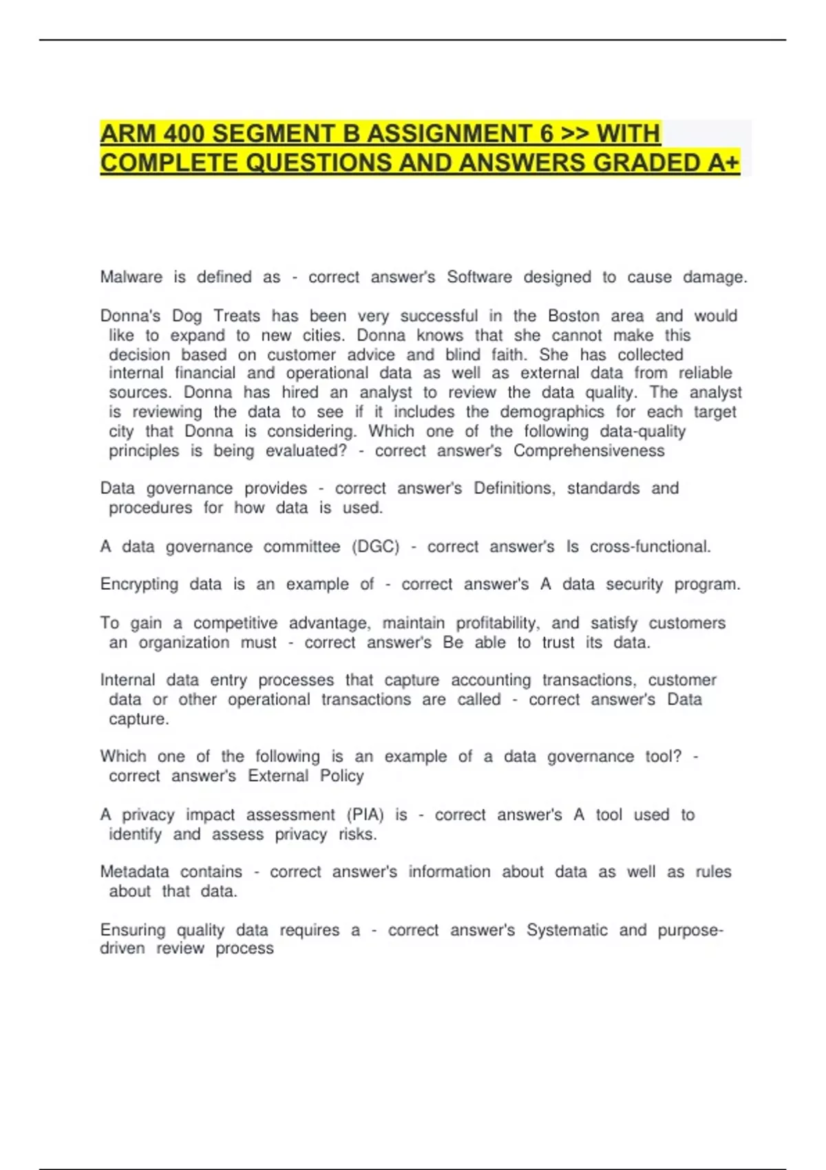 ARM 400 SEGMENT B ASSIGNMENT 6 >> WITH COMPLETE QUESTIONS AND ANSWERS GRADED A+
