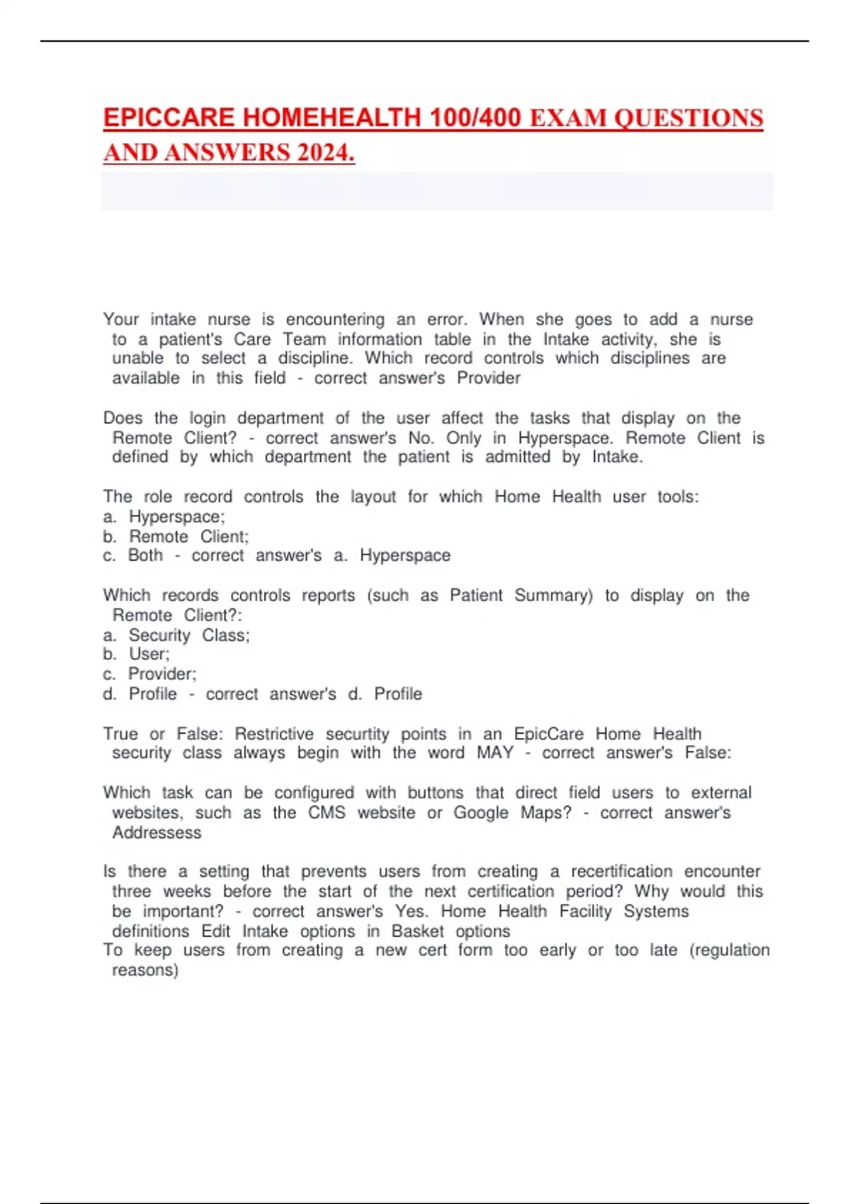 EPICCARE HOMEHEALTH 100/400 EXAM QUESTIONS AND ANSWERS 2024.