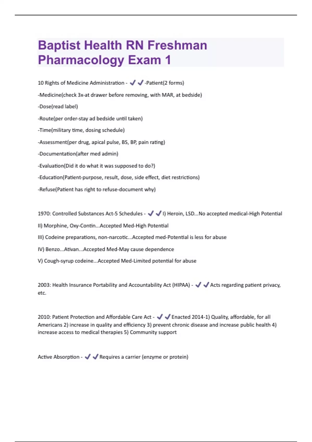 10 Rights of Medicine Administration - -Patient(2 forms) -Medicine(check 3x-at drawer before removing, with MAR, at bedside) -Dose(read label) -Route(per order-stay ad bedside until taken) -Time(military time, dosing schedule) -Assessment(per drug, apical pulse, BS, BP, pain rating) -Documentation(after med admin) -Evaluation(Did it do what it was supposed to do?) -Education(Patient-purpose, result, dose, side effect, diet restrictions) -Refuse(Patient has right to refuse-document why) 1970: Controlled Substances Act-5 Schedules - I) Heroin, LSD...No accepted medical-High Potential II) Morphine, Oxy-Contin...Accepted Med-High Potential III) Codeine preparations, non-narcotic...Accepted med-Potential is less for abuse IV) Benzo...Ativan...Accepted Med-May cause dependence V) Cough-syrup codeine...Accepted Med-Limited potential for abuse 2003: Health Insurance Portability and Accountability Act (HIPAA) - Acts regarding patient privacy, etc. 2010: Patient Protection and Affordable Care Act - Enacted 2014-1) Quality, affordable, for all Americans 2) increase in quality and efficiency 3) prevent chronic disease and increase public health 4) increase access to medical therapies 5) Community support Active Absorption - Requires a carrier (enzyme or protein)Additive effect - 2 drugs with similar actions-sum of both Adverse Reactions - 1) More severe than side effects 2) undesirable 3) Must always be reported and documented Agonist - Drugs that produce a response All meds are ______________ at the time of surgery - Discontinued All pre-op medications must be ____________ - reordered individually Allergic Effects - The immune system responds to what the body sees as a foreign object and forms antibodies against the drug American Hospital Formulary Service Drug Information - Published by the American Society of Health System Pharmacists-Accurate and complete info on all drugs chemistry, stability, toxicity and preparation Anaphylaxis - 1) medical emergency 2) results in respiratory distress, sudden severe bronchospasms and cardiovascular collapse 3) vasopressors, bronchdialators, corticosteroids, oxygen therapy, IV fluids, antihistamines Antagonist - Drugs that block a response Antagonist effect - Produces less effect than that of each drug alone-cancels out Because of renal disease, the drug usually needs to be ___________to prevent toxicity - decreasedBest Teaching Strategy - 1) Nurse Demonstrates 2) Patient Return Demonstration 3) Multiple Sessions and Practice Each Step Separately Bioavailability - % of administered drug dose reaching circulation Brand/Trade Name - Proprietary name, chosen by the drug company, trademark (Ex. Tylenol) Chemical Name - Name of drug by chemical structure Common tests to determine renal function _________ and __________ - creatine clearance and blood urea nitrogen Controlled substances are kept ____A_____, counted ___B___ at ___C___ and ___D___ of shift, count before and after removal of any medicine, a witness is required for ___E___ and document, record and documentation is required for narcotic administration - A) locked in a drawer B) daily C) beginning D) end E) disposal Creatine clearance is decreased in older patients and those with ____________ - renal disease Culturally Sensative - Use simple and clear instruction Ask open-ended questions, demonstrate and verbalize Cumulative effect - more drugs are taken than excreted