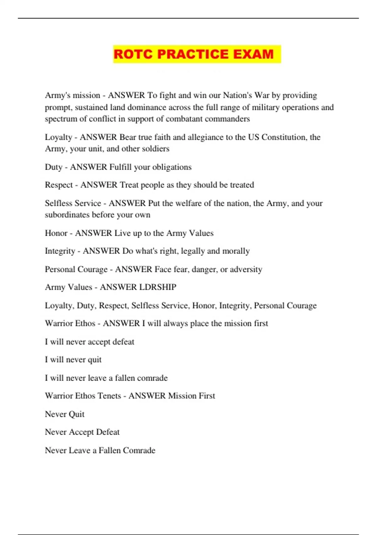 ROTC PRACTICE EXAM Army's mission - ANSWER To fight and win our Nation's War by providing prompt, sustained land dominance across the full range of military operati ons and spectrum of conflict in support of combatant commanders Loyalty - ANSWER Bear true faith and allegiance to the US Constitution, the Army, your unit, and other soldiers Duty - ANSWER Fulfill your obligations Respect - ANSWER Treat people as they should be treated Selfless Service - ANSWER Put the welfare of the nation, the Army, and your subordinates before your own Honor - ANSWER Live up to the Army Values Integrity - ANSWER Do what's right, legally and morally Personal Courage - ANSWER Face fear, danger, or adversity Army Values - ANSWER LDRSHIP Loyalty, Duty, Respect, Selfless Service, Honor, Integrity, Personal Courage Warrior Ethos - ANSWER I will always place the mission first I will never accept defeat I will never quit I will never leave a fallen comrade Warrior Ethos Tenets - ANSWER Mission First Never Qu it Never Accept Defeat Never Leave a Fallen Comrade Building Blocks of Warrior Ethos - ANSWER Soldier Warrior Ethos Tenets Army Values Commitment to serve the nation Soldier - ANSWER Adaptive Competent Confident Physical and Mental Toughness Core Leader Competencies - ANSWER Leads Develops Achieves Leads - ANSWER Lead others Extends influence beyond the chain of command Leads by examples Communicate Develops - ANSWER Creates a positive environment Prepares self Develops Others Achieves - ANSWER Gets results Leadership - ANSWER Influencing people by providing purpose, direction, and motivation, while operating to accomplish the mission and improving the organization Army leader Attributes - ANSWER A leader of character