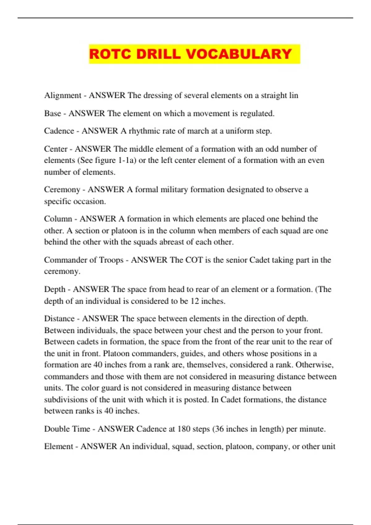 ROTC DRILL VOCABULARY Alignment - ANSWER The dressing of several elements on a straight lin Base - ANSWER The element on which a movement is regulated. Cadence - ANSWER A rhythmic rate of march at a uniform step. Center - ANSWER The middle element of a formation with an odd number of elements (See figure 1-1a) or the left center element of a formation with an even number of elements. Ceremony - ANSWER A formal military formation designated to observe a specific occasion. Column - ANSWER A formation in which elements are placed one behind the other. A section or platoon is in the column when members of each squad are one behind the other with the squads abreast of each other. Commander of Troops - ANSWER The COT is the senior Cadet taking part in the ceremony. Depth - ANSWER The space from head to rear of an element or a formation. (The depth of an individual is considered to be 12 inches. Distance - ANSWER The space between elements in the direction of depth. Between individuals, the space between your chest and the person to your fro nt. Between cadets in formation, the space from the front of the rear unit to the rear of the unit in front. Platoon commanders, guides, and others whose positio ns in a formation are 40 inches from a rank are, themselves, considered a rank. Otherwise, commanders and those with them are not considered in measuring distance bet ween units. The color guard is not considered in measuring distance between subdivisions of the unit with which it is posted. In Cadet formation s, the distance between ranks is 40 inches. Double Time - ANSWER Cadence at 180 steps (36 inches in length) per minute. Element - ANSWER An individual, squad, section, platoon, company, o r other unit that is part of a larger uni t. Extended Mass Formation - ANSWER The formation of a company or larger unit in which major elements are in column at close or normal interval and abreast at a specified interval greater than normal interval. File - ANSWER A single column of cadets one behind the other. Flank - ANSWER The right or left extremity of a unit, either in line or in column. The element on the extreme right or left of the line. A direction at a right angle to the direction an element or a formation is facing. Formation - ANSWER Arrangement of elements of a unit in line, in column, or in any other prescribed manner. Front - ANSWER The space occupied by an element or a formation, measured from one flank to the other. The front of an individual is considered to be 22 inches Guide - ANSWER The individual (base) upon whom a formation, or other elements there of, regulates its march. To guide: to regulate interval, directi on, or alignment; to regulate cadence on a base file (right, left, or center). Head - ANSWER The leading element of a column. Interval - ANSWER The lateral space between elements on the same line. Interval is measured between individuals from shoulder to shoulder. It is measured between elements other than individuals and between formations from flank to flank. U nit commanders and those with them are not considered in measuring interval b etween elements of the unit. Normal interval between individuals is one arm 's length. Close interval is the horizontal distance when the left hand is placed on the l eft hip. Left (Right) - ANSWER Extreme left (right) element or edge of a body of cadets. Line - ANSWER A formation in which the elements are side by side or abreast of