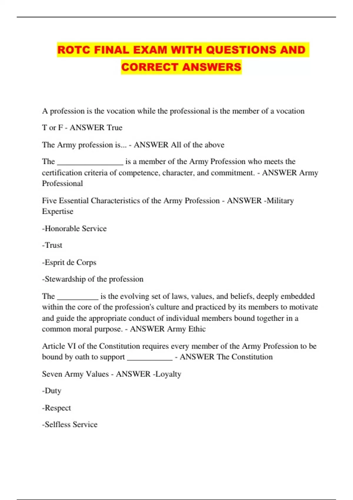 ROTC FINAL EXAM WITH QUESTIONS AND CORRECT ANSWERS A profession is the vocation while the professional is the member of a vo cation T or F - ANSWER True The Army profession is... - ANSWER All of the above The ________________ is a member of the Army Profession who meets the certification criteria of competence, character, and commitment. - ANSWER Army Professional Five Essential Characteristics of the Army Profession - ANSWER -Military Expertise -Honorable Service -Trust -Esprit de Corps -Stewardship of the profession The __________ is the evolving set of laws, values, and beliefs, deeply emb edded within the core of the profession's culture and practiced by its members to mot ivate and guide the appropriate conduct of individual members bound together i n a common moral purpose. - ANSWER Army Ethic Article VI of the Constitution requires every member of the Army Profession to be bound by oath to support ___________ - ANSWER The Constitution Seven Army Values - ANSWER -Loyalty -Duty -Respect -Selfless Service -Honor -Integrity -Personal Courage Four tenants of the Warrior Ethos in correct order - ANSWER -I will always place the mission first -I will never accept defeat -I will never quit -I will never leave a fallen comrade Loyalty is bearing witness to your allegiance to the US Constitution and it s ideas, to the Army, to your unit, to your fellow Soldiers and subordinates, and to yourself as an Army professional T or F - ANSWER True The Army is guided by __________ - ANSWER Values Put the welfare of the nation the army and your subordinates before your own. Which value is this? - ANSWER Selfless service Army Values and the Warrior Ethos are ____________; you can't fully follow o ne while ignoring the other - ANSWER Mutually dependent Leadership is defined as the process of _____________ people by providing ________________, _____________, and ______________ to accomplish a mission and improve the organization - ANSWER influencing, purpo se, direction, motivation The attribute that draws from your conceptual abilities and is applied t o your duties and your responsibilities - ANSWER Intellect The attribute that determines who you are, how you act, helps you determine rig ht from wrong, and to choose what is right. - ANSWER Character The attribute that is the sum of your outward appearance, demeanor, actions, an d words - ANSWER Presence