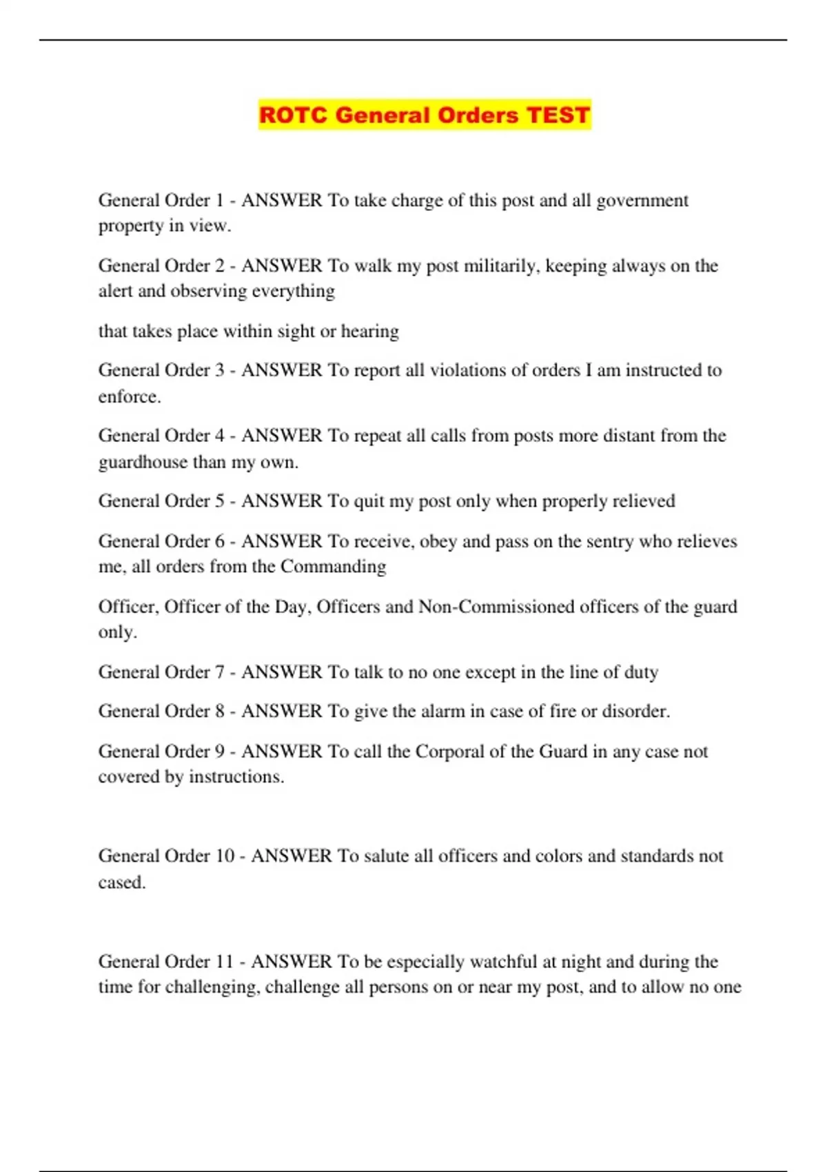 ROTC General Orders TEST General Order 1 - ANSWER To take charge of this post and all government property in view. General Order 2 - ANSWER To walk my post militarily, keeping always on the alert and observing everything that takes place within sight or hearing General Order 3 - ANSWER To report all violations of orders I am instructed to enforce. General Order 4 - ANSWER To repeat all calls from posts more distant from the guardhouse than my own. General Order 5 - ANSWER To quit my post only when properly relieved General Order 6 - ANSWER To receive, obey and pass on the sentry who relieves me, all orders from the Commanding Officer, Officer of the Day, Officers and Non-Commissioned officers of the guard only. General Order 7 - ANSWER To talk to no one except in the line of duty General Order 8 - ANSWER To give the alarm in case of fire or disorder. General Order 9 - ANSWER To call the Corporal of the Guard in any case not covered by instructions. General Order 10 - ANSWER To salute all officers and colors and standards not cased. General Order 11 - ANSWER To be especially watchful at night and during the time for challenging, challenge all persons on or near my post, and to allow no one