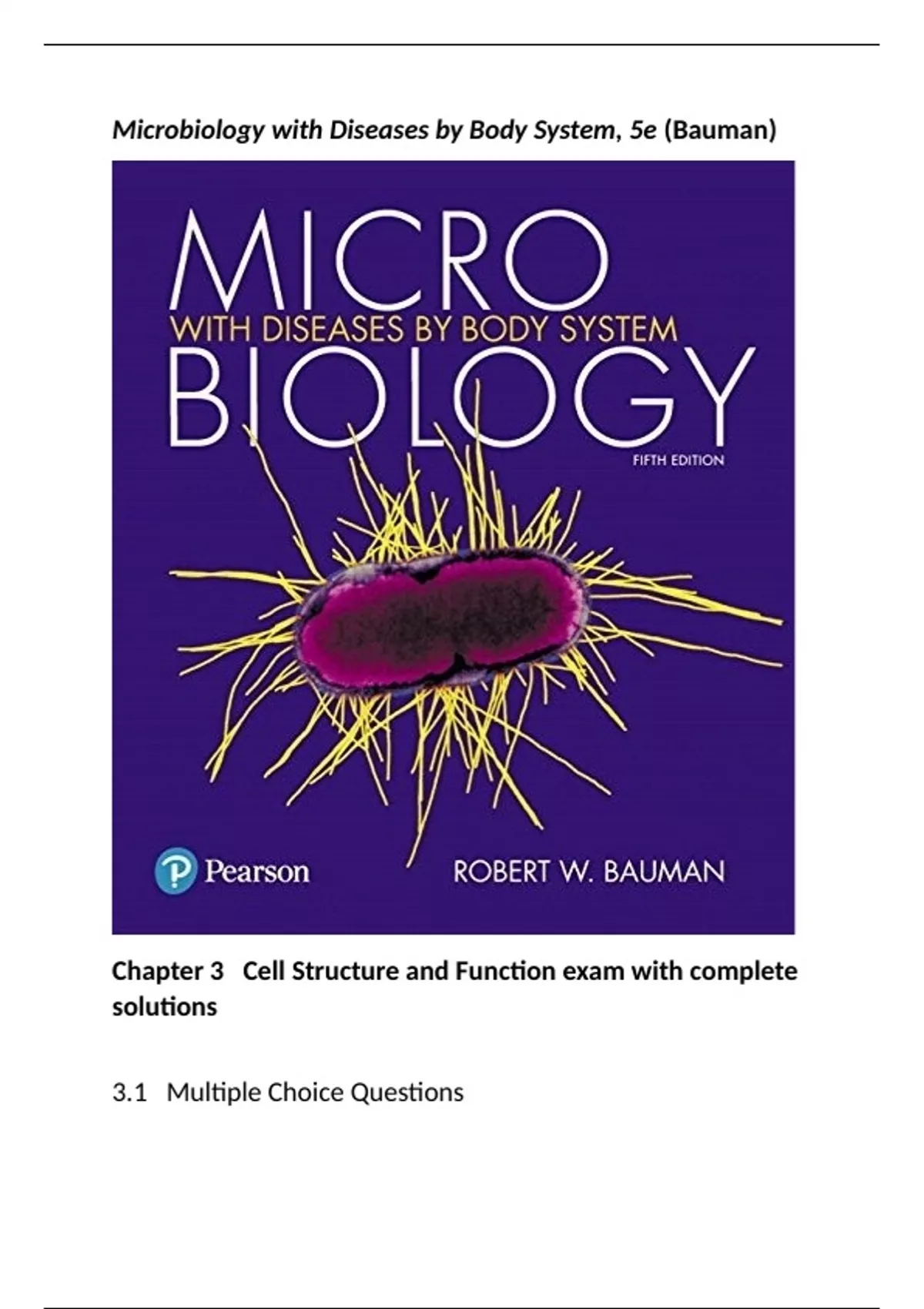 1) Using a microscope, you observe an amoeba moving toward a food source. This is an example of A) reproduction. B) cellular structure. C) metabolism. D) growth. E) responsiveness. Answer: E Bloom's Taxonomy: Comprehension Section: Processes of Life Learning Outcome: 3.1 2) Which of the following is NOT a component of bacterial flagella? A) flagellin B) basal body C) tubulin D) filament E) hook Answer: C Bloom's Taxonomy: Comprehension Section: External Structure of Bacterial Cells Learning Outcome: 3.5 3) Which of the following statements concerning the characteristics of life is FALSE? A) Reproduction is defined as an increase in the size of an organism. B) Viruses have some, but not all,