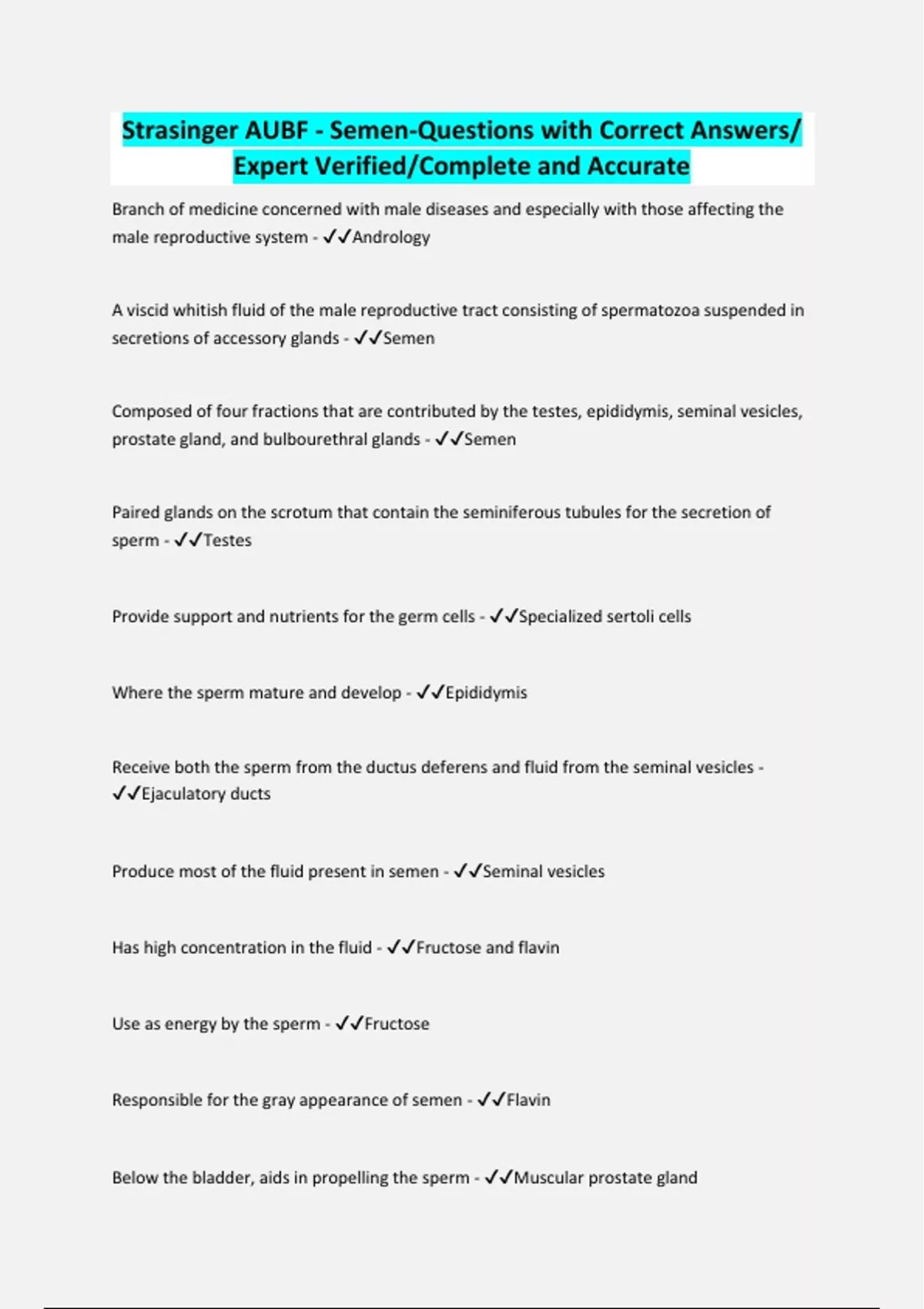 Strasinger AUBF - Semen-Questions with Correct Answers/ Expert Verified/Complete and Accurate