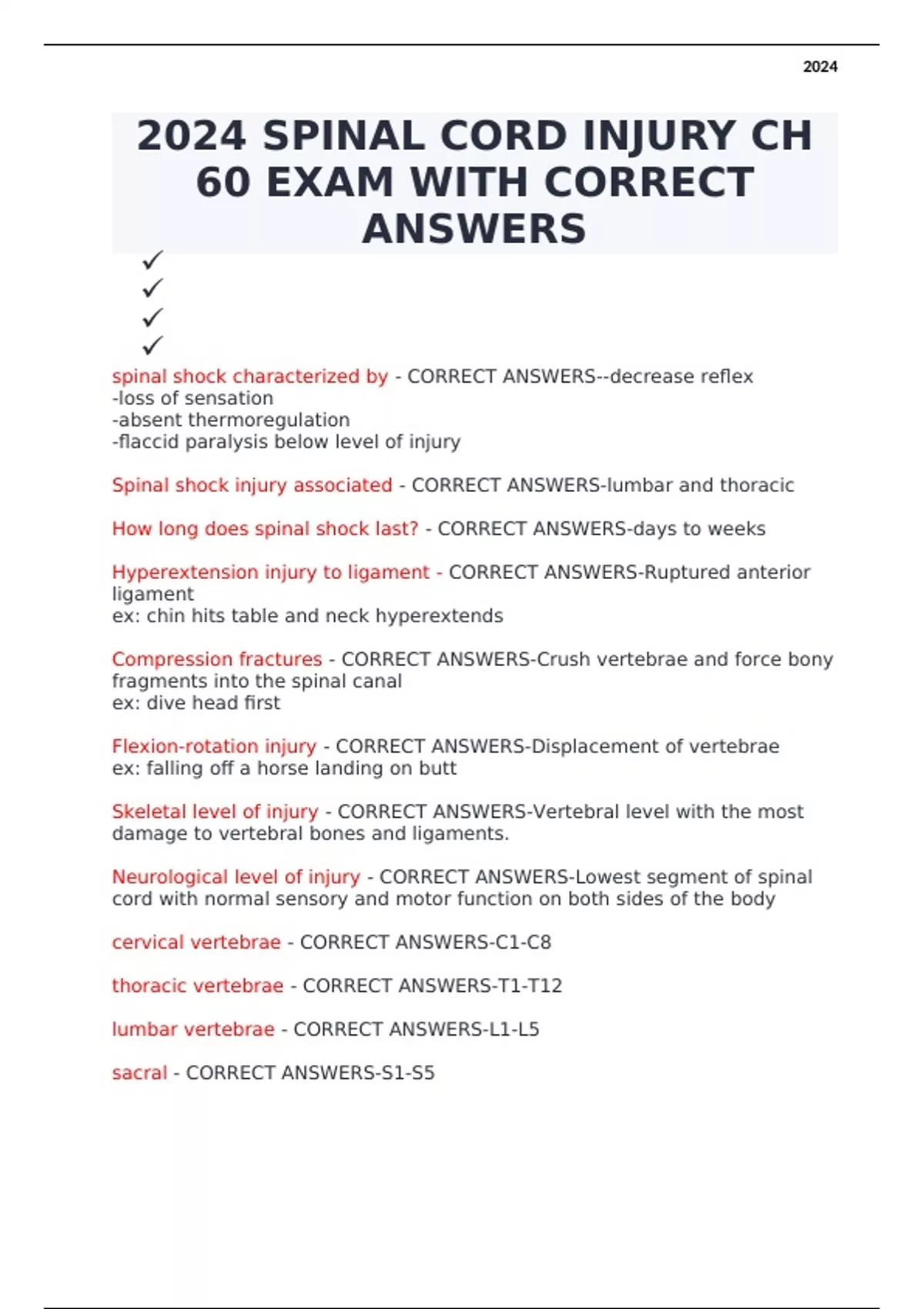 2024 SPINAL CORD INJURY CH 60 EXAM WITH CORRECT ANSWERS 