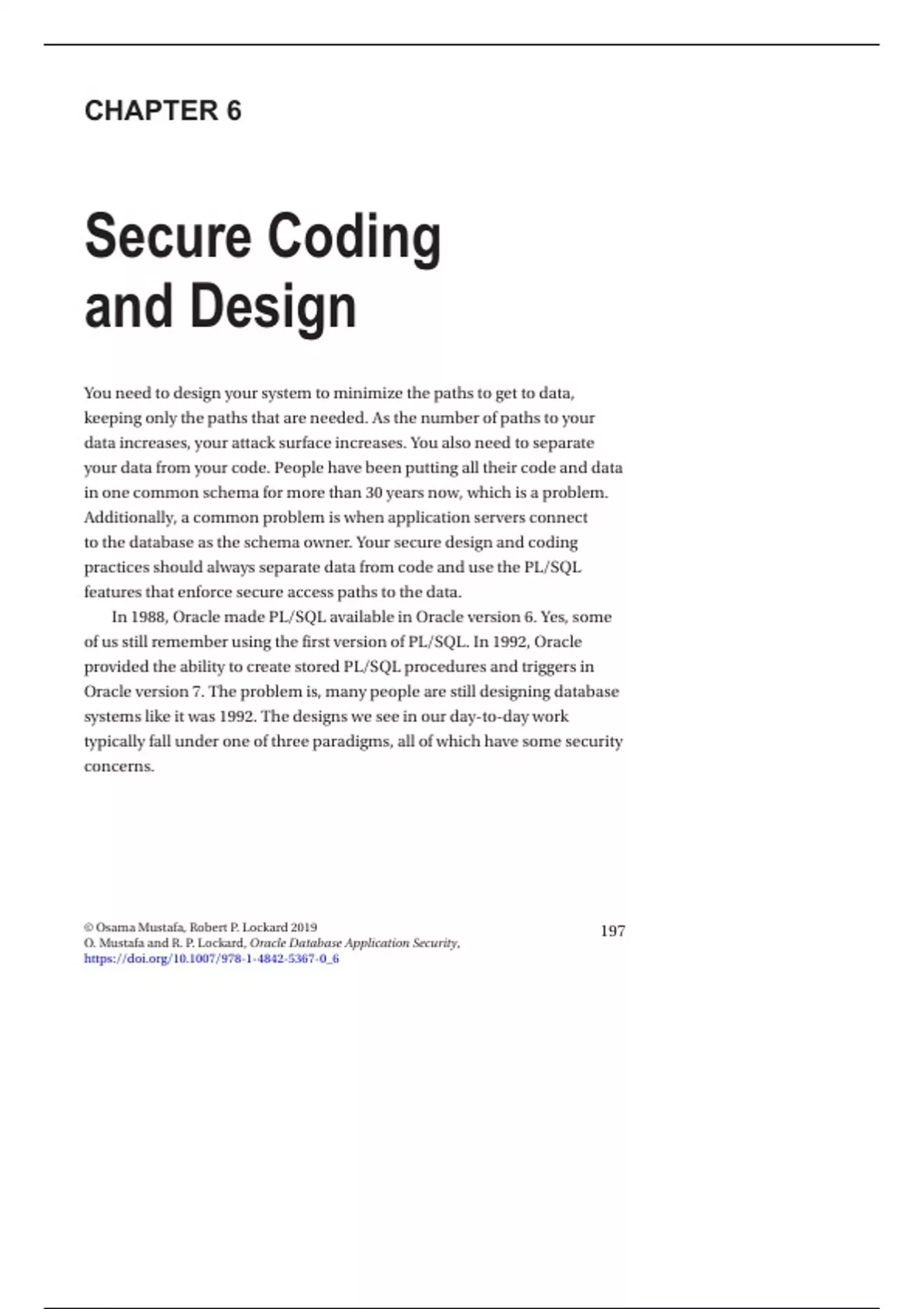 Secure Coding and Design You need to design your system to minimize the paths to get to data, keeping only the paths that are needed. As the number of paths to your data increases, your attack surface increases. You also need to separate your data from your code. People have been putting all their code and data in one common schema for more than 30 years now, which is a problem. Additionally, a common problem is when application servers connect to the database as the schema owner. Your secure design and coding practices should always separate data from code and use the PL/SQL features that enforce secure access paths to the data. In 1988, Oracle made PL/SQL available in Oracle version 6. Yes, some of us still remember using the first version of PL/SQL. In 1992, Oracle provided the ability to create stored PL/SQL procedures and triggers in Oracle version 7. The problem is, many people are still designing database systems like it was 1992. The designs we see in our day-to-day work typically fall under one of three paradigms, all of which have some security concerns. 198 Problematic Designs Figure 6-1 is by far the most common design paradigm and problem we see in our work. The data and PL/SQL code coexists in one schema, and the user is granted execute privileges on the PL/SQL, along with select, update, insert, and delete privileges on data objects. By default, when you create a procedure, package, or function, it is created with definer’s rights, meaning the code executes with the same privileges as the schema it resides in. Because the code resides in the same schema as the tables, the code has full access to all the data in the schema. Do you see the problem here? All it takes is one SQL injection bug, and the bad guy owns your database. Data and Code User Figure 6-1. All data and code are stored in a common database schema Figure 6-2 shows the next most common design paradigm and problem that we see in our work. The data is stored in the database, and all the application code including SQL Data Manipulation Language (DML) and Data Definition Language (DML) resides outside of the database in Java, PHP, or Python. The application server connects to the database as the schema owner, so the user does not need to be granted access to the underlying data objects. Again, all it takes is one SQL injection bug, and the bad guy owns your databases. Another problem with this configuration is that the security of the application is left up to the application code. Chapter 6 SeCure Coding and deSign 199 As we all know, code has bugs, and this configuration does not leverage the security mechanisms built into the database. In addition, this configuration increases the size of the attack surface. The SQL code that is stored in the application code is frequently generated using frameworks that do not optimize the amount of data that is transmitted over the network. USER Data App Server. Business Logic Figure 6-2. All application logic including DDL and DML is stored outside the database Figure 6-3 shows another common problem we see. Data and code are stored in a database schema, and some SQL is stored outside of the database in Java, PHP, or Python. The SQL is either generated by a framework or handwritten into the code. This configuration has a few problems with it. Let’s start with SQL that is generated by a framework. You will suffer performance issues, because the SQL generated by the framework will cause excessive network traffic, and you’ll likely also be dealing with the SQL having to recompile every time it sends a request to the database. These are two big performance issues. Then we’re back to the SQL injection issue; if the bad guy finds a SQL injection bug, he owns your database. Because there is more network traffic than required, the attack surface has been increased. Chapter 6 SeCure Coding and deSign 200 Improved Design Now we’ll discuss what we need to do to implement a trusted path to the data. The first thing we need to do is separate the data and PL/SQL code into different schemas. Your business logic code calls the API that performs the required DML. This is all done inside the database, minimizing network round-trips and thereby reducing the attack surface and improving application performance. In Figure 6-4 we’ve separated the code from the data, executed the code using code-based access control (CBAC), and granted roles to the code. By doing these simple steps, if we have a SQL injection bug in one API, we’re not exposing all of the data to the bad guys. This reduces the attack surface quite a bit. Additional advantages of this design paradigm are improved performance and ease of maintenance.