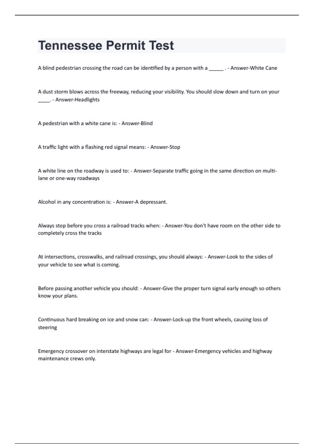 Tennessee Permit Test 2024/2025 Questions and Answers with complete solution