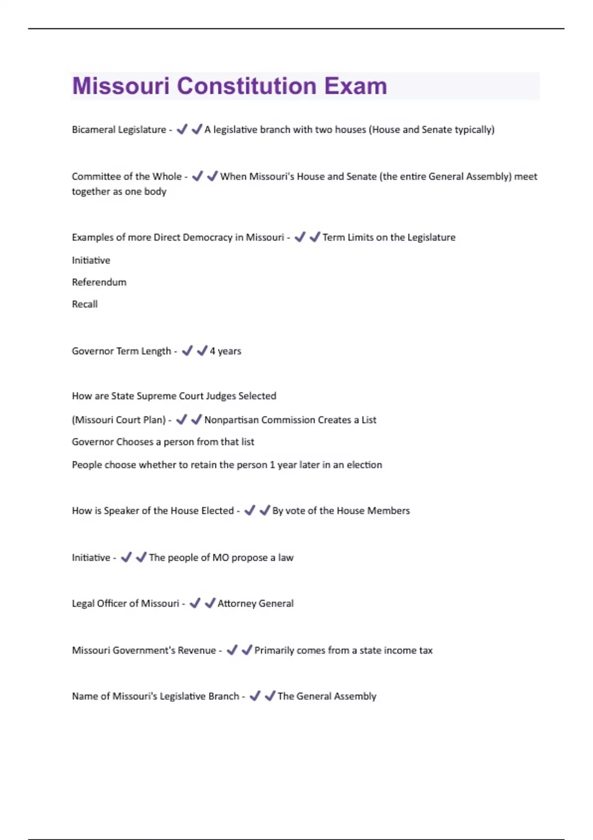 Bicameral Legislature - A legislative branch with two houses (House and Senate typically) Committee of the Whole - When Missouri's House and Senate (the entire General Assembly) meet together as one body Examples of more Direct Democracy in Missouri - Term Limits on the Legislature Initiative Referendum Recall Governor Term Length - 4 years How are State Supreme Court Judges Selected (Missouri Court Plan) - Nonpartisan Commission Creates a List Governor Chooses a person from that list People choose whether to retain the person 1 year later in an election How is Speaker of the House Elected - By vote of the House Members Initiative - The people of MO propose a law Legal Officer of Missouri - Attorney General Missouri Government's Revenue - Primarily comes from a state income tax Name of Missouri's Legislative Branch - The General AssemblyNumber of Supreme Court Justices - 7 Powers of the General Assembly - Pass Laws, Override Governor Vetoes Powers of the Governor in the law making process - veto, sign, & propose laws Recall - Removing an elected official from office Referendum - The people approve or appeal any changes to the MO Constitution Requirements for Missouri Governor - 30 years old, US Citizen for at least 15 years, Live in Missouri for at least 10 years Term Length for Missouri Judges - 12 years The Missouri Judicial System is modeled after what? - The Federal Judicial System (but it is separate from) What is the title of the Presiding Officer of the Senate - President of the Senate When was the Missouri Constitution First Written? - 1820 Who is the Presiding Officers of the Senate - Lieutenant Governor