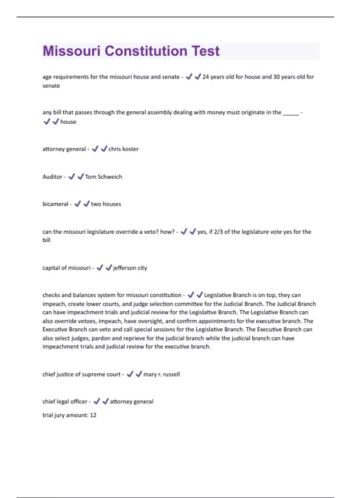 Missouri Constitution Test Questions and Answers 100% Verified