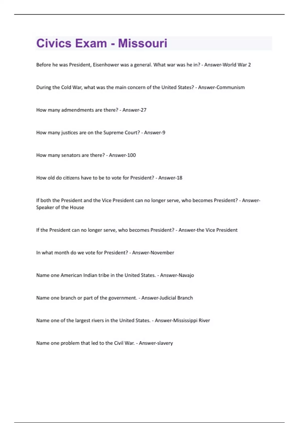 Before he was President, Eisenhower was a general. What war was he in? - Answer-World War 2 During the Cold War, what was the main concern of the United States? - Answer-Communism How many admendments are there? - Answer-27 How many justices are on the Supreme Court? - Answer-9 How many senators are there? - Answer-100 How old do citizens have to be to vote for President? - Answer-18 If both the President and the Vice President can no longer serve, who becomes President? - AnswerSpeaker of the House If the President can no longer serve, who becomes President? - Answer-the Vice President In what month do we vote for President? - Answer-November Name one American Indian tribe in the United States. - Answer-Navajo Name one branch or part of the government. - Answer-Judicial Branch Name one of the largest rivers in the United States. - Answer-Mississippi River Name one problem that led to the Civil War. - Answer-slaveryName one right only for United States citizens. - Answer-vote in a federal election Name one state that borders Canada. - Answer-New York Name one state that borders Mexico. - Answer-Texas Name one U.S. territory. - Answer-Puerto Rico