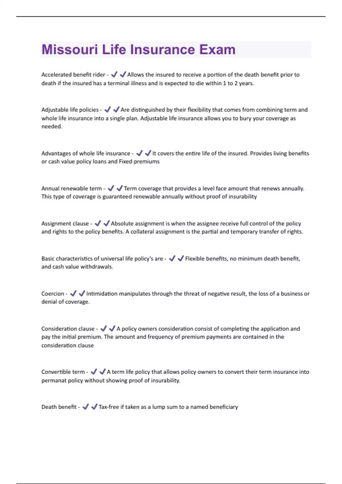 Accelerated benefit rider - Allows the insured to receive a portion of the death benefit prior to death if the insured has a terminal illness and is expected to die within 1 to 2 years. Adjustable life policies - Are distinguished by their flexibility that comes from combining term and whole life insurance into a single plan. Adjustable life insurance allows you to bury your coverage as needed. Advantages of whole life insurance - It covers the entire life of the insured. Provides living benefits or cash value policy loans and Fixed premiums Annual renewable term - Term coverage that provides a level face amount that renews annually. This type of coverage is guaranteed renewable annually without proof of insurability Assignment clause - Absolute assignment is when the assignee receive full control of the policy and rights to the policy benefits. A collateral assignment is the partial and temporary transfer of rights. Basic characteristics of universal life policy's are - Flexible benefits, no minimum death benefit, and cash value withdrawals. Coercion - Intimidation manipulates through the threat of negative result, the loss of a business or denial of coverage. Consideration clause - A policy owners consideration consist of completing the application and pay the initial premium. The amount and frequency of premium payments are contained in the consideration clause Convertible term - A term life policy that allows policy owners to convert their term insurance into permanat policy without showing proof of insurability. Death benefit - Tax-free if taken as a lump sum to a named beneficiaryDeath benefit installments - The principle is tax-free and interest is taxable Decreasing term - Term life insurance that provides a decreasing face amount overtime with six premiums. These policies are usually use for mortgage protection Defamation - Defamation is making any derogatory or maliciously critical remarks, statements or publications about it and sure or financial institution with the intent to harm. Drawbacks of whole life insurance - Protection is more expensive because of living benefits and premium paint. May extend beyond the income you're earning years Exclusions - If he sure of life insurance policy stating that the policy will not cover certain risks.