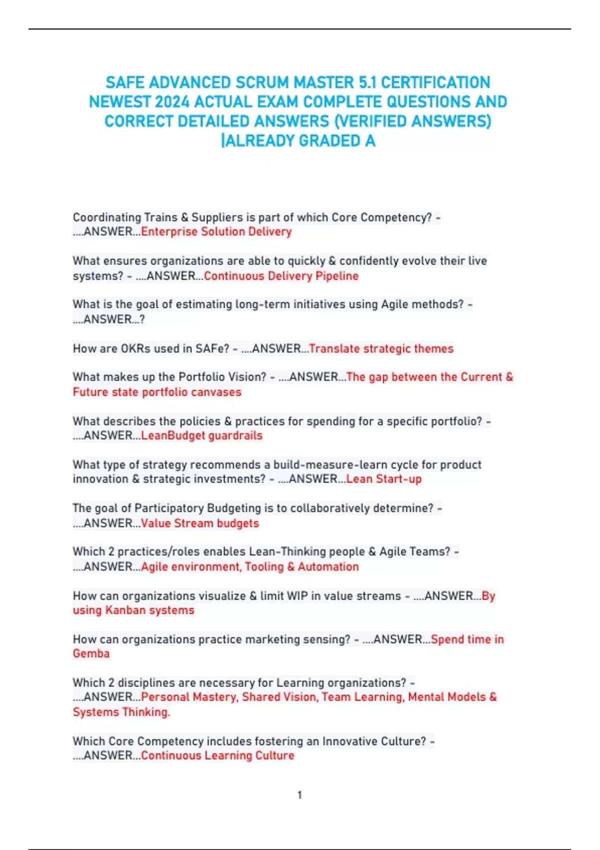 SAFE ADVANCED SCRUM MASTER 5.1 CERTIFICATION NEWEST 2024 ACTUAL EXAM COMPLETE QUESTIONS AND CORRECT DETAILED ANSWERS (VERIFIED ANSWERS) |ALREADY GRADED A