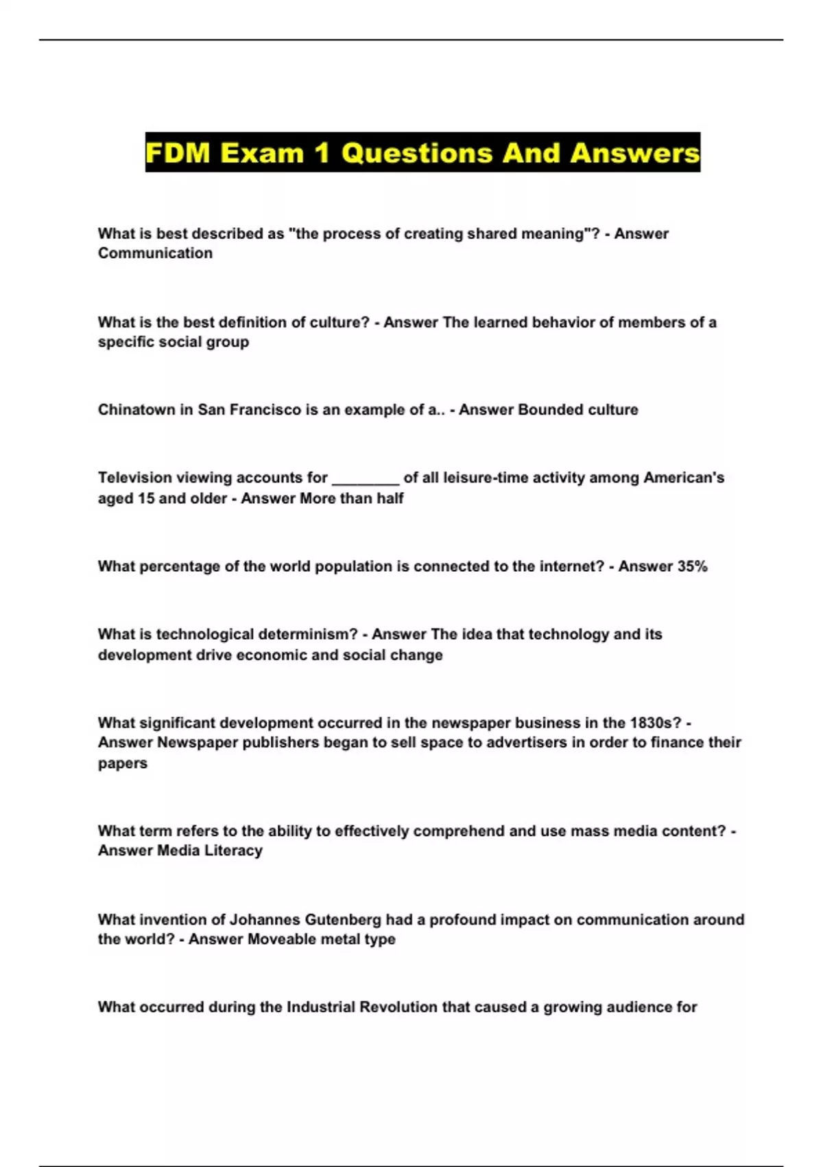 FDM Exam 1 Questions And Answers What is best described as "the process of creating shared meaning"? - Answer Communication What is the best definition of culture? - Answer The learned behavior of members of a specific social group Chinatown in San Francisco is an example of a.. - Answer Bounded culture Television viewing accounts for ________ of all leisure-time activity among Ameri can's aged 15 and older - Answer More than half What percentage of the world population is connected to the internet? - Answer 35 % What is technological determinism? - Answer The idea that technology and its development drive economic and social change What significant development occurred in the newspaper business in the 1830s? - Answer Newspaper publishers began to sell space to advertisers in order to f inance their papers What term refers to the ability to effectively comprehend and use mass media content? - Answer Media Literacy What invention of Johannes Gutenberg had a profound impact on communication around the world? - Answer Moveable metal type What occurred during the Industrial Revolution that caused a growing audience for