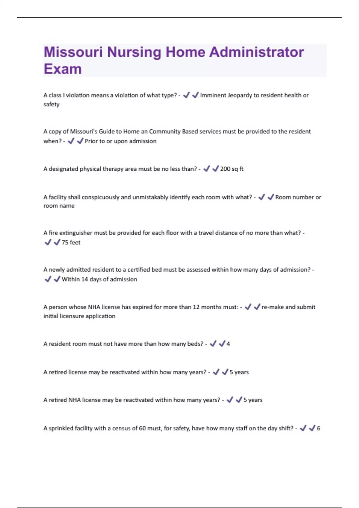 A class I violation means a violation of what type? - Imminent Jeopardy to resident health or safety A copy of Missouri's Guide to Home an Community Based services must be provided to the resident when? - Prior to or upon admission A designated physical therapy area must be no less than? - 200 sq ft A facility shall conspicuously and unmistakably identify each room with what? - Room number or room name A fire extinguisher must be provided for each floor with a travel distance of no more than what? - 75 feet A newly admitted resident to a certified bed must be assessed within how many days of admission? - Within 14 days of admission A person whose NHA license has expired for more than 12 months must: - re-make and submit initial licensure application A resident room must not have more than how many beds? - 4 A retired license may be reactivated within how many years? - 5 years A retired NHA license may be reactivated within how many years? - 5 years A sprinkled facility with a census of 60 must, for safety, have how many staff on the day shift? - 6A temporary emergency license may be extended how many times? - once After a fire is discovered and extinguished, the facility must visually monitor the area for how many hours and how often? - 24 hours and hourly visual checks All exit doors in new facilities must be how wide? - 44 inches All poisonous or toxic materials shall be stored how? - Locked and not accessible to residents All resident-accessible areas must be cooled when air temps exceed how much? - 85F All residents who receive treatment in an Alzheimer's special care program or unit must be given a copy of what? - Alzheimer's Special Care Services Disclosure form Amount of annual certification fee to participate in Medicaid and Medicare - $1000 annually An request to renew a waiver must be submitted how far in advance? - 45 days in advance Any person who acts or serves in the capacity of NHA without a license is guilty of what? - A misdemeanor Anyone found guilty of misappropriation of funds of the elderly or disabled, is guilty of what type of felony? - Class D felony At time of service to the resident, food shall be what temp? - 45 or below for cold, 120 for hot Battery operated lights must be tested how often? - Every month