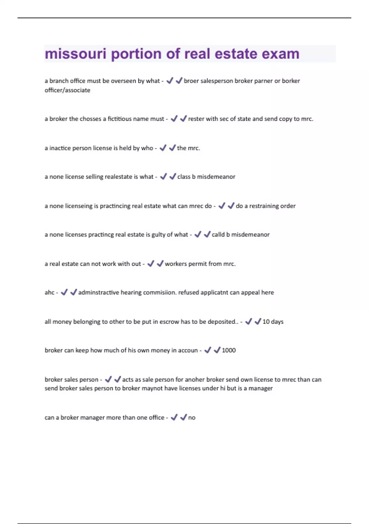 a branch office must be overseen by what - broer salesperson broker parner or borker officer/associate a broker the chosses a fictitious name must - rester with sec of state and send copy to mrc. a inactice person license is held by who - the mrc. a none license selling realestate is what - class b misdemeanor a none licenseing is practincing real estate what can mrec do - do a restraining order a none licenses practincg real estate is gulty of what - calld b misdemeanor a real estate can not work with out - workers permit from mrc. ahc - adminstractive hearing commisiion. refused applicatnt can appeal here all money belonging to other to be put in escrow has to be deposited.. - 10 days broker can keep how much of his own money in accoun - 1000 broker sales person - acts as sale person for anoher broker send own license to mrec than can send broker sales person to broker maynot have licenses under hi but is a manager can a broker manager more than one office - nocan a brokers collect commision from net listings? - not net lising commisiion are illegal in mo. can a person take continu ed classes out of the sate - yes if mrecc accepts them chapter 339 is also called what - license law dispute escrow money - must hold until recieves relies from parties or court. is neither goes to court in 60 days can give oney to injured party do agncy relatioship contracts have a extension - no hae a expiration date no automatic extensions. do all disclosers about being a license have to be in wrting or just disclosed - must be in writing. do all discolouseres have to be in writing - yes how long must broker obtain records like escow buss contracs ets - 3 years how long of notice must buiz give mrec if changeing name or addres - 10 days how many hours of continuring education do licenee need? - 12/ 3 requird rest elective must benifit public if no resalution is made on escrow money what do brokers do - send money to state treasury if one does not finish contunie3d education classes what happens - 50 fee per month not compledted 200 max and must retake the missouri practice class if one fails to take continuing ed classes what msut they do - take the practice course and pay a 50 fee per onth late up to 200 maxif person is den died license they hacve the right to file a complaint with the - ahc if sales person is terminated when does broker have to notify mrec. - 72 hours