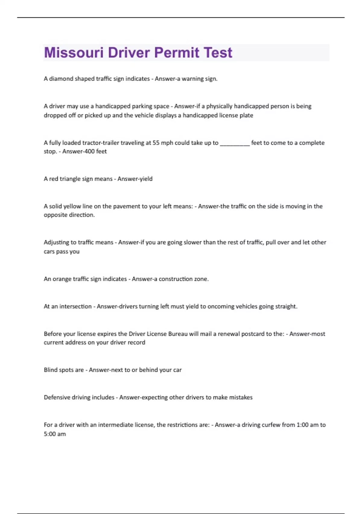 A diamond shaped traffic sign indicates - Answer-a warning sign. A driver may use a handicapped parking space - Answer-if a physically handicapped person is being dropped off or picked up and the vehicle displays a handicapped license plate A fully loaded tractor-trailer traveling at 55 mph could take up to _________ feet to come to a complete stop. - Answer-400 feet A red triangle sign means - Answer-yield A solid yellow line on the pavement to your left means: - Answer-the traffic on the side is moving in the opposite direction. Adjusting to traffic means - Answer-if you are going slower than the rest of traffic, pull over and let other cars pass you An orange traffic sign indicates - Answer-a construction zone. At an intersection - Answer-drivers turning left must yield to oncoming vehicles going straight. Before your license expires the Driver License Bureau will mail a renewal postcard to the: - Answer-most current address on your driver record Blind spots are - Answer-next to or behind your car Defensive driving includes - Answer-expecting other drivers to make mistakes For a driver with an intermediate license, the restrictions are: - Answer-a driving curfew from 1:00 am to 5:00 amFor night driving, you should - Answer-use your high beams if there is no oncoming traffic Hydroplaning can happen at any speed over ___. - Answer-35 mph If a lane is not marked: - Answer-stay in the right lane unless you need to pass. If a train is coming while you are approaching the tracks - Answer-you must stop if the lights are flashing If a vehicle is approaching you head on in your lane - Answer-pull over to the right If there is no line or crosswalk at the stop sign - Answer-fully stop before the intersection. If you are at fault in an accident and do not pay for the damages - Answer-your driver license and/or plates will be suspended for one year If you are confronted with someone with road rage, you should - Answer-get a description of the vehicle and driver If you are in an accident - Answer-exchange insurance information with the other drivers If you are younger than 21, your driver license may not be taken away if - Answer-you are not visibly drunk If you fail the driving test three times... - Answer-the Department of Revenue will require driver training. If you notice an emergency vehicle, you must - Answer-pull over to the right of the road and stop If you refuse to take a chemical test of your blood alcohol concentration - Answer-your driver license will be taken away for one yearIf you see a funeral processing you may - Answer-only enter an intersection if you do not cross the path of the procession If you start to skid - Answer-gently turn your steering wheel in the direction that your rear wheels are sliding If your car breaks down on the highway, it is important to remember - Answer-get you car off of the roadway and in clear view if possible In Missouri, if a minor's blood alcohol concentration is over _____, their license will be taken away. - Answer-.02% In Missouri, the blood alcohol concentration level that is illegal for an adult to drive a vehicle is - Answer- .08% or more