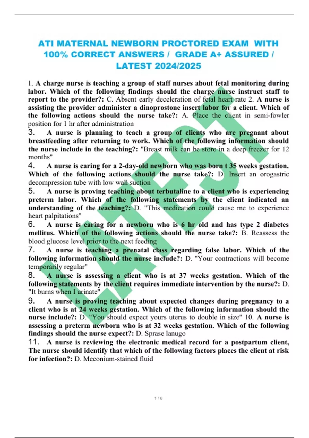 ATI MATERNAL NEWBORN PROCTORED EXAM WITH 100% CORRECT ANSWERS GRADE A+ ASSURED / LATEST