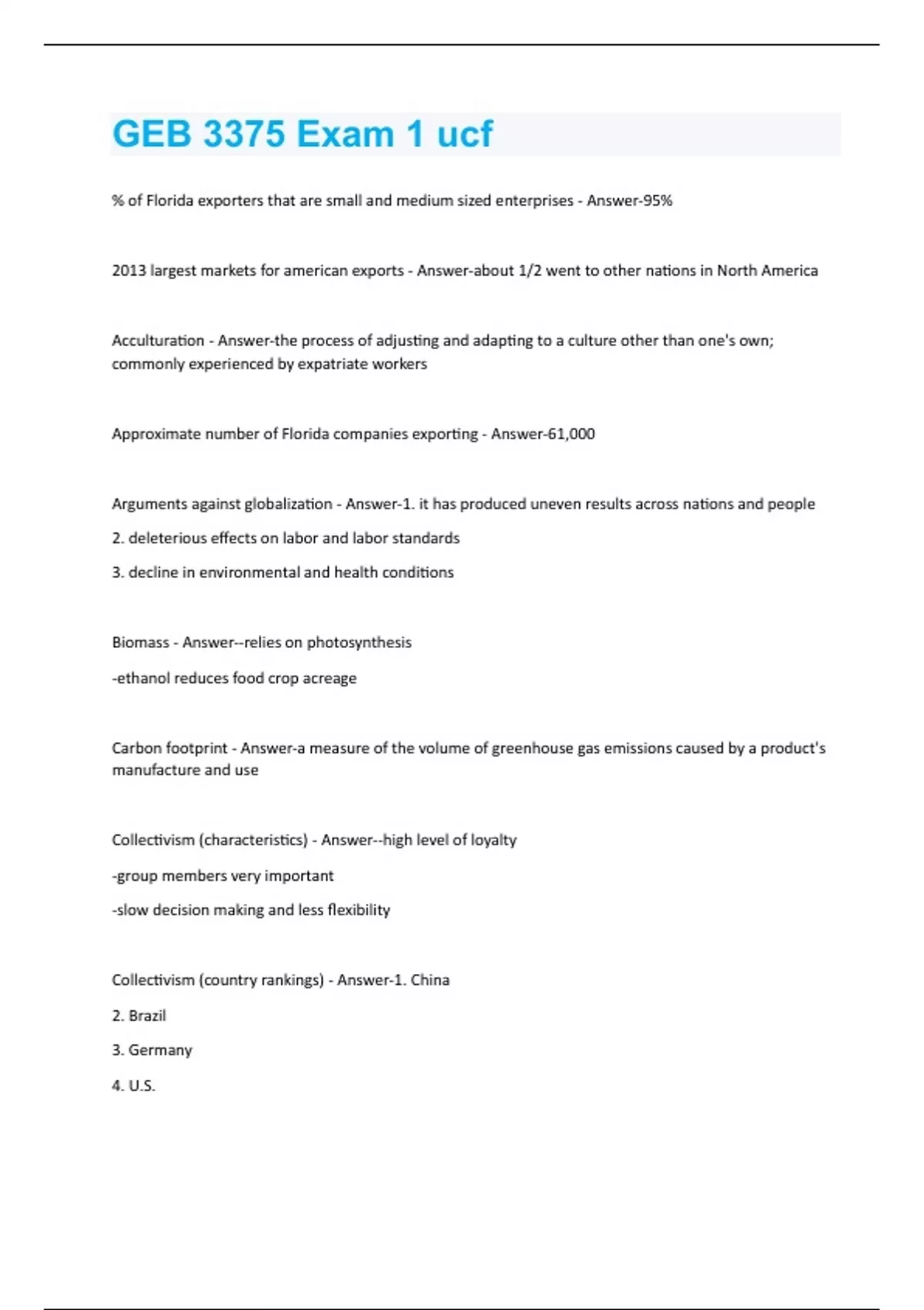 % of Florida exporters that are small and medium sized enterprises - Answer-95% 2013 largest markets for american exports - Answer-about 1/2 went to other nations in North America Acculturation - Answer-the process of adjusting and adapting to a culture other than one's own; commonly experienced by expatriate workers Approximate number of Florida companies exporting - Answer-61,000 Arguments against globalization - Answer-1. it has produced uneven results across nations and people 2. deleterious effects on labor and labor standards 3. decline in environmental and health conditions Biomass - Answer--relies on photosynthesis -ethanol reduces food crop acreage Carbon footprint - Answer-a measure of the volume of greenhouse gas emissions caused by a product's manufacture and use Collectivism (characteristics) - Answer--high level of loyalty -group members very important -slow decision making and less flexibility Collectivism (country rankings) - Answer-1. China 2. Brazil 3. Germany 4. U.S.Collectivism (definition) - Answer-the degree to which a culture or subculture emphasizes the well-being and role of a group Communication context - Answer-the degree in which communication (verbal and non-verbal) needs some degree of "interpretation" by the receiver in order to understand the true meaning of the message Concentrating solar thermal power (CSP) - Answer--uses mirrors or lenses to collect sunlight that heats water -different technology than PV, growing plants in U.S., Spain Countervailing duties - Answer-competitors in importing nations frequently ask their governments to impose these to offset the effects of a subsidy Countries that are the source of a lot of FDI - Answer-1. U.S. 2. China 3. UK 4. Germany 5. Japan Countries that receive a lot of FDI - Answer-1. China 2. Hong Kong 3. U.S. 4. UK 5.Singapore Country risk assessment (CRA) - Answer-an assessment of a country's economic situation and politics to determine how much risk to employees, property, and investment exists for the firm doing business thereCradle-to-cradle (C2C) design - Answer-suggests that products and services should be designed to completely close the production, so that all resources needed to produce them are recycled and reused rather that discarded or left to pollute Culture (2 definitions) - Answer--the learned, charged, and enduring orientation patterns in society demonstrated through values, ideas, attitudes, behaviors, and symbols -a collective programming of the mind that distinguishes the members of one group or category of people from another Culture (characteristics) - Answer--applies to nationalities as well as sub-cultures (professions) -influences: how people behave, negotiate, communicate, what people buy, food preferences, risk taking, behavior interpretation, expectations Customs and administrative procedures (NTB) - Answer-cover a large variety of government policies and procedures that either discriminate against or favor exports Do governments sometimes have legitimate reasons to restrict free trade? - Answer-yes Drivers of Globalization (all based on change) - Answer-1. Political 2. Technological 3. Market 4. Cost 5. Competitive Dumping - Answer-consists of selling a product abroad for less than the cost of the product, less than the price in the home market, or less than the price to third-party countries Economies of scale - Answer-the predictable decline in the average cost of producing each unit of output as a production facility gets larger and output increases (also works for services) Environments sustainability - Answer-concept is about maintaining something- the environment, society, the economy people within the economy, or the organizationEthnocentric orientation (consequences) - Answer-stereotypes (generalizations that may or may not be factual and often overlook real, deeper differences) Ethnocentric orientation (definition) - Answer-using our own culture as the standard for judging other cultures (we believe that the way we act, see the world, the things we like etc. is superior to others) Example of Competitive driver of globalization - Answer-internationalize or die Example of Cost driver of globalization - Answer-economies of scale, wage differentials Example of Market driver of globalization - Answer-tap into demand or suppliers in other markets