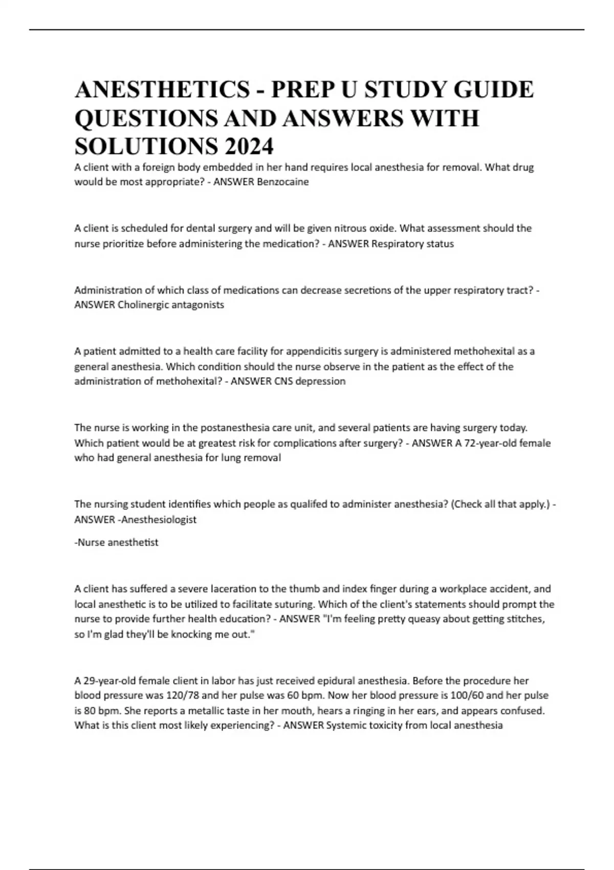ANESTHETICS - PREP U STUDY GUIDE QUESTIONS AND ANSWERS WITH SOLUTIONS 2024