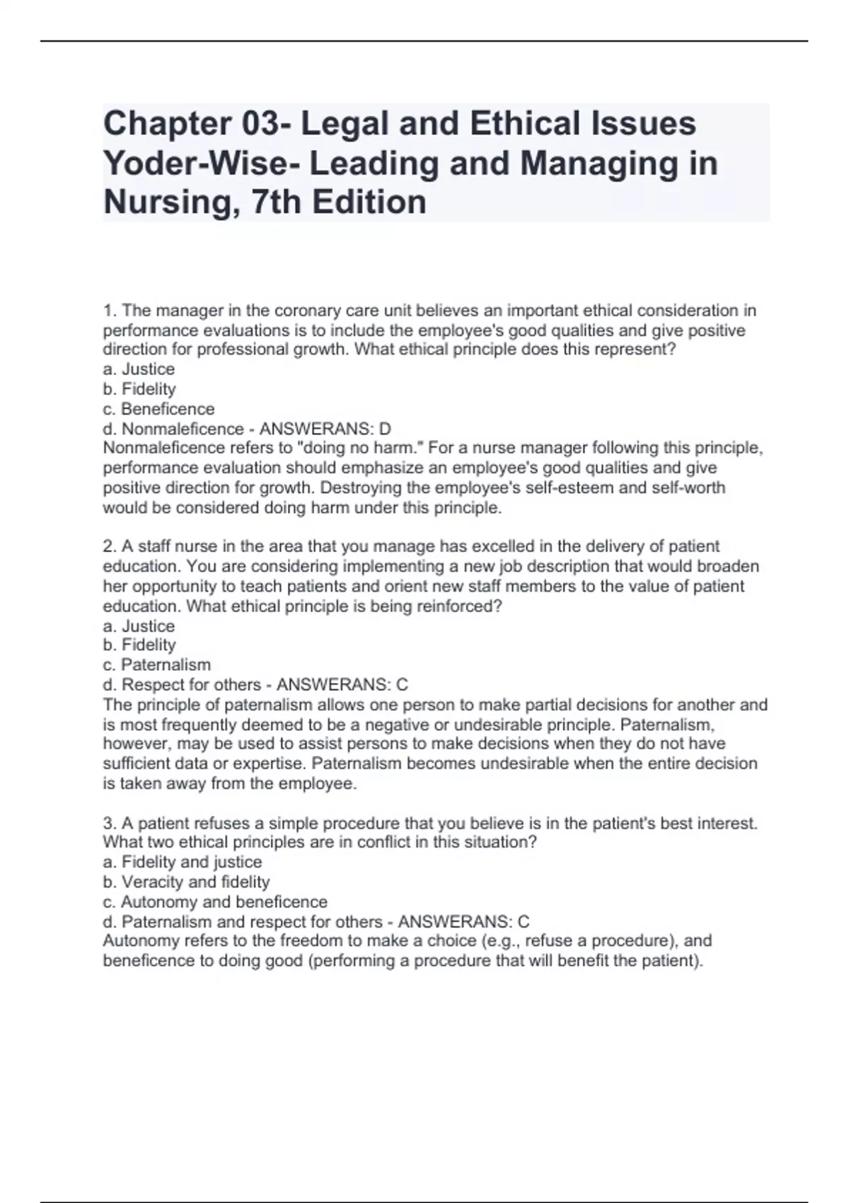 Chapter 03- Legal and Ethical Issues Yoder-Wise- Leading and Managing in Nursing, 7th Edition.Theory questions and answers