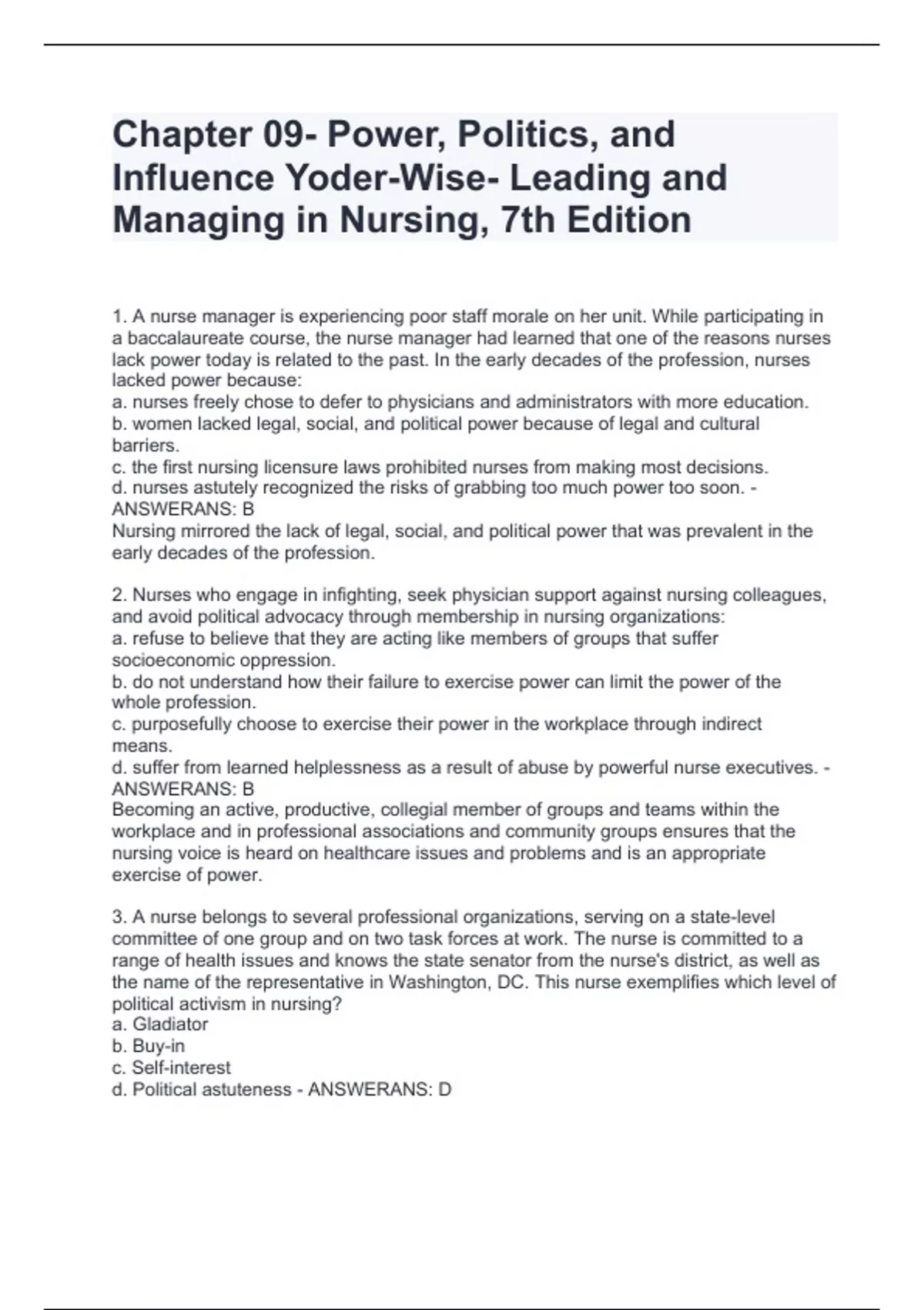 Chapter 09- Power, Politics, and Influence Yoder-Wise- Leading and Managing in Nursing, 7th Edition.Interview questions with answers rated A+
