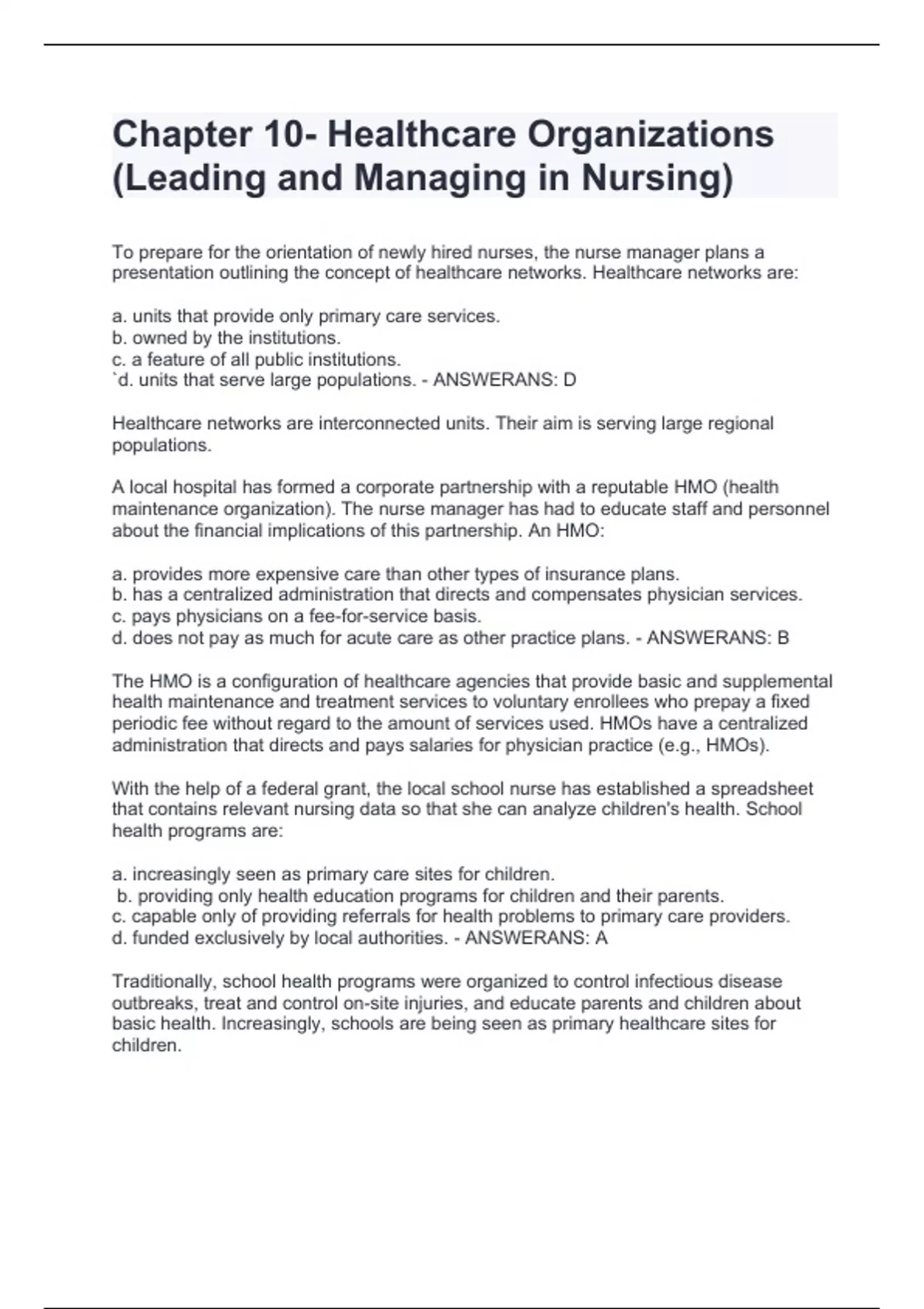 Chapter 10- Healthcare Organizations (Leading and Managing in Nursing).Questions with strong answers 2024