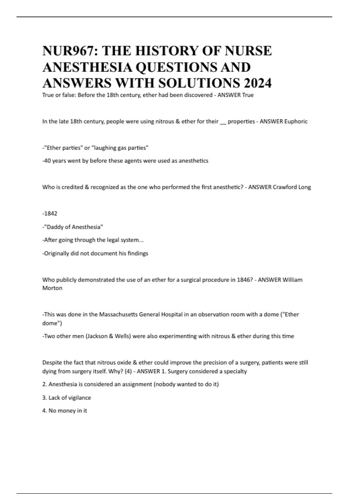 NUR967: THE HISTORY OF NURSE ANESTHESIA QUESTIONS AND ANSWERS WITH SOLUTIONS 2024
