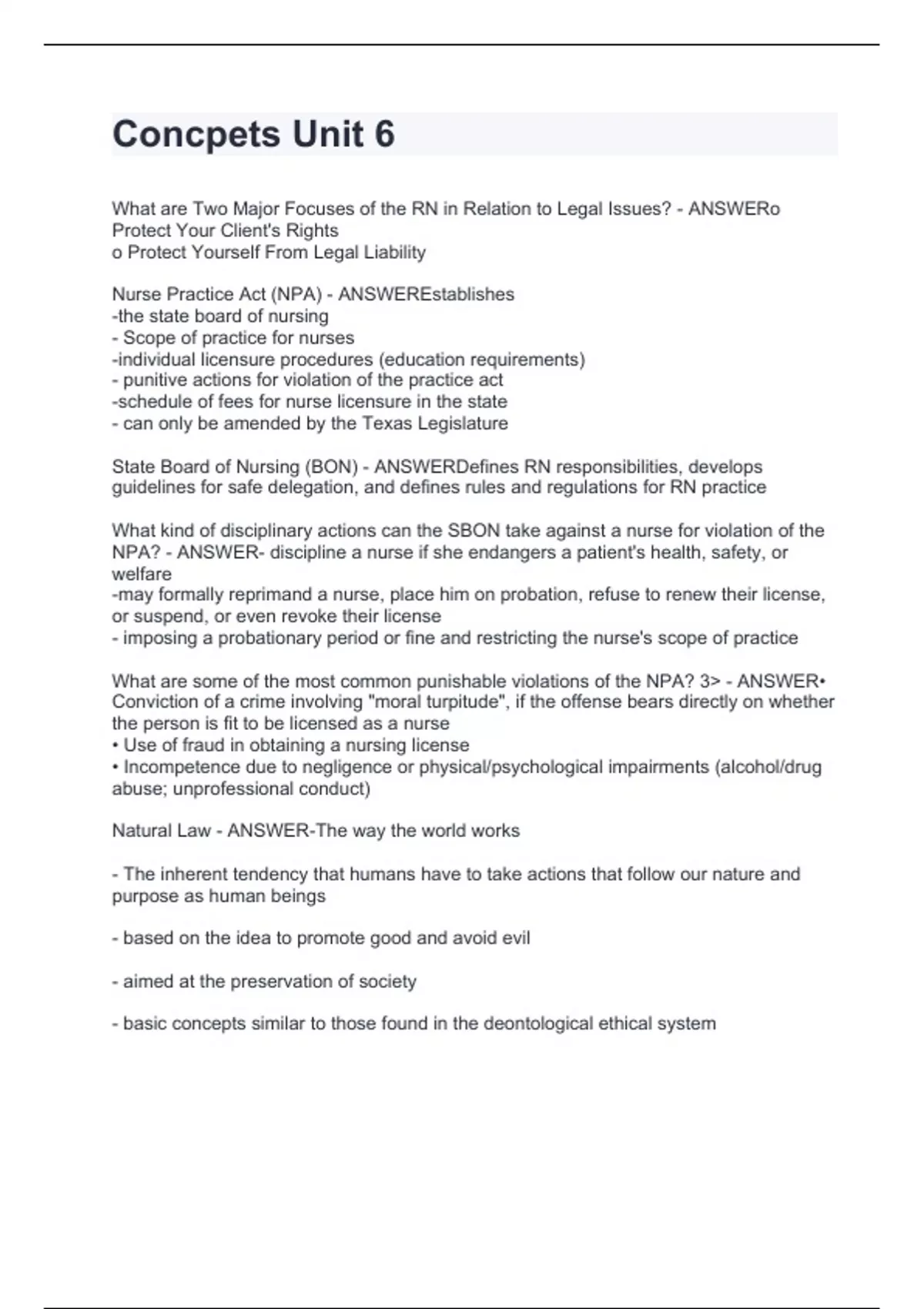 Exam of 7 pages for the course TEXAS NURSING JUDICAL at TEXAS NURSING JUDICAL (Concpets Unit 6.)