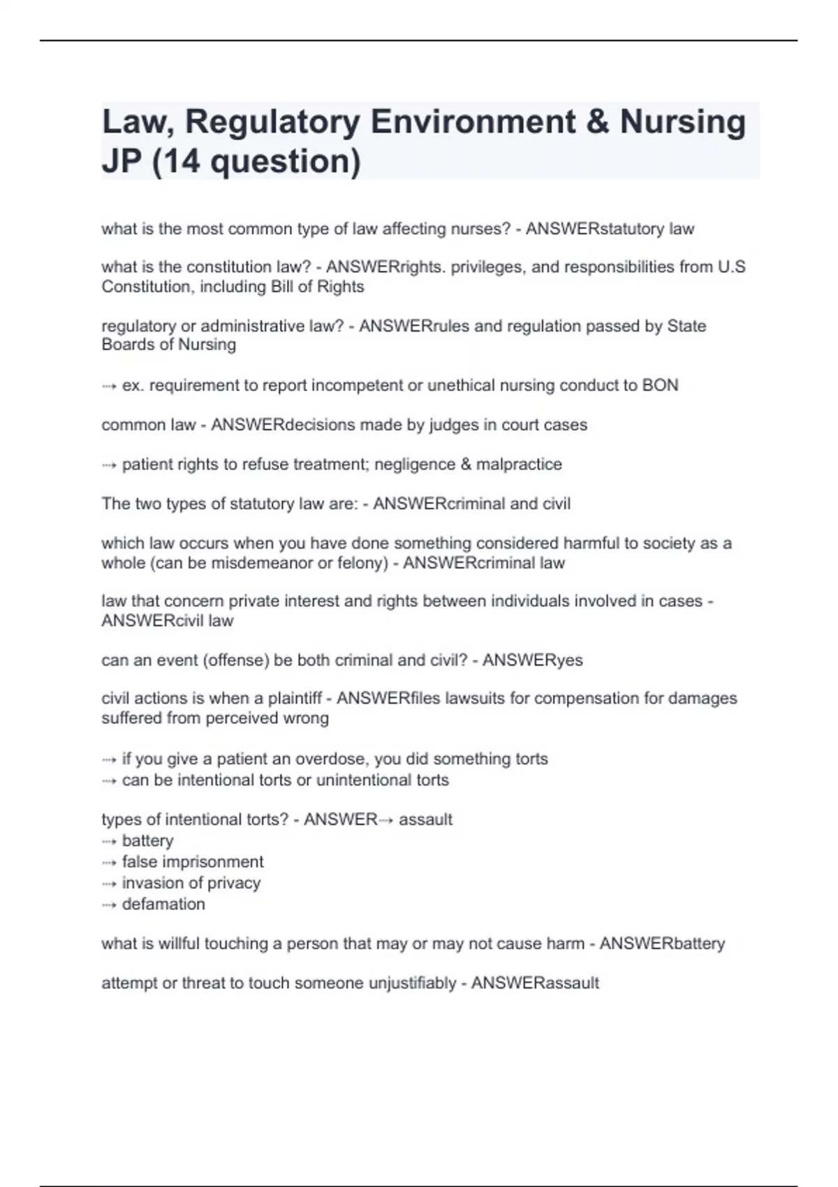 Law, Regulatory Environment & Nursing JP (14 question).Written exams with latest 2024